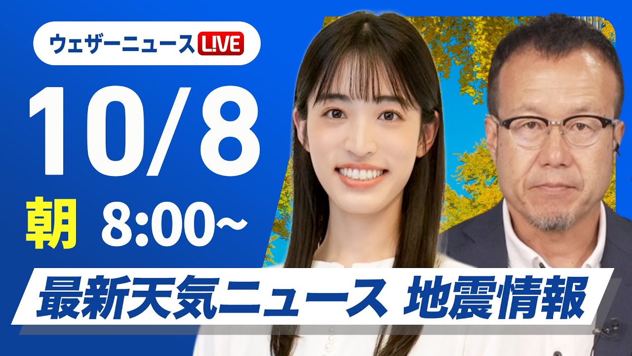 【ライブ】最新天気ニュース・地震情報 2025年10月8日(水) /台風22号 今夜以降は伊豆諸島で大雨や記録的な暴風警戒 早めの対策・避難〈ウェザーニュースLiVEサンシャイン・松本真央/内藤邦裕〉