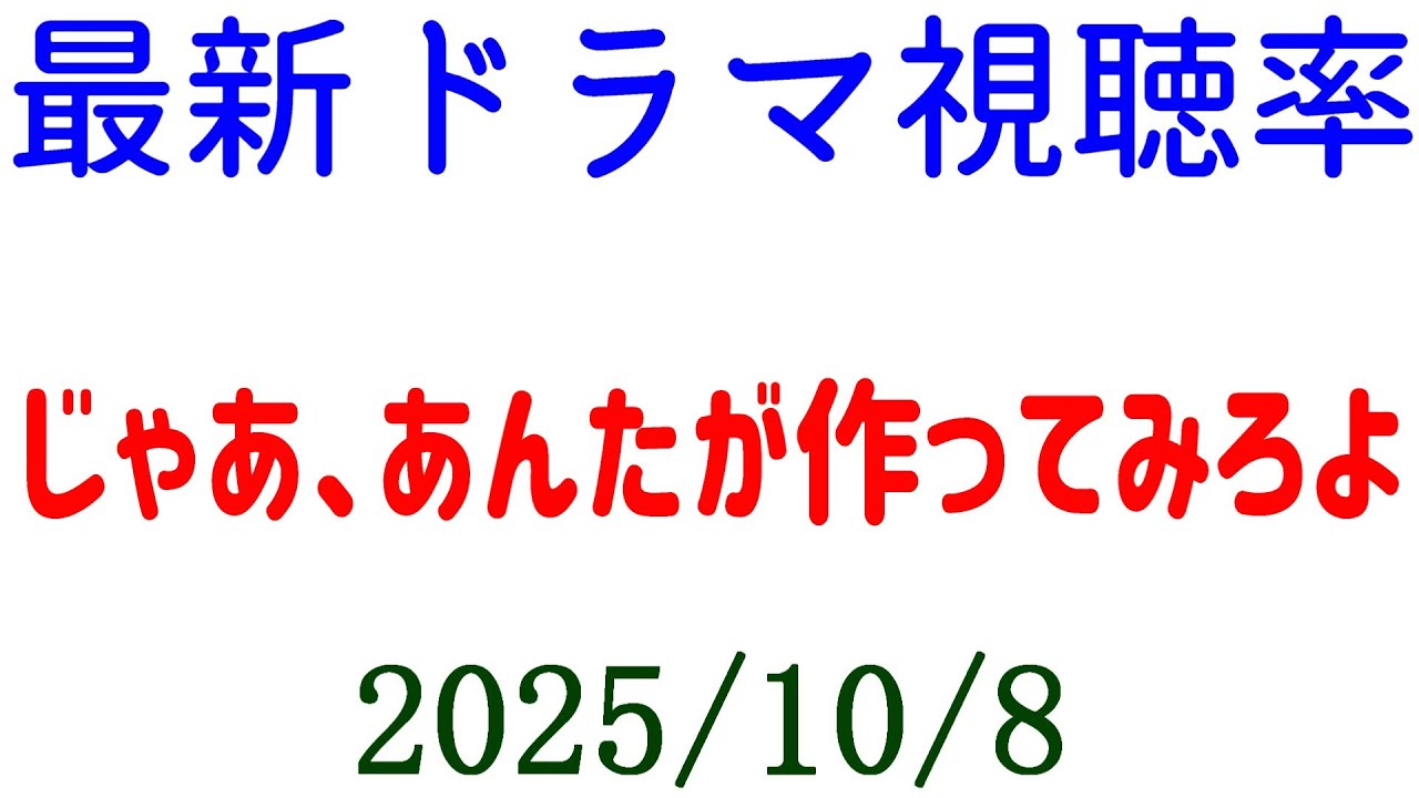 じゃあ、あんたが作ってみろよ☆視聴率速報☆2025年10月8日 ### ☆Amazon欲しいものリスト https://www.amazon.jp/hz/wishlist/ls/3MTQPTNTTWFUH?ref_=wl_share <ツイッター> https://twitter.com/KkReviewこのチャンネルのメンバーになって特典にアクセスしてください: https://www.youtube.com/channel/UC8I3iWxXV7Zqa5PpAeAlcFA/join dramaTVドラマテレビドラマドラマドラマ視聴率レビュー感想考察視聴率