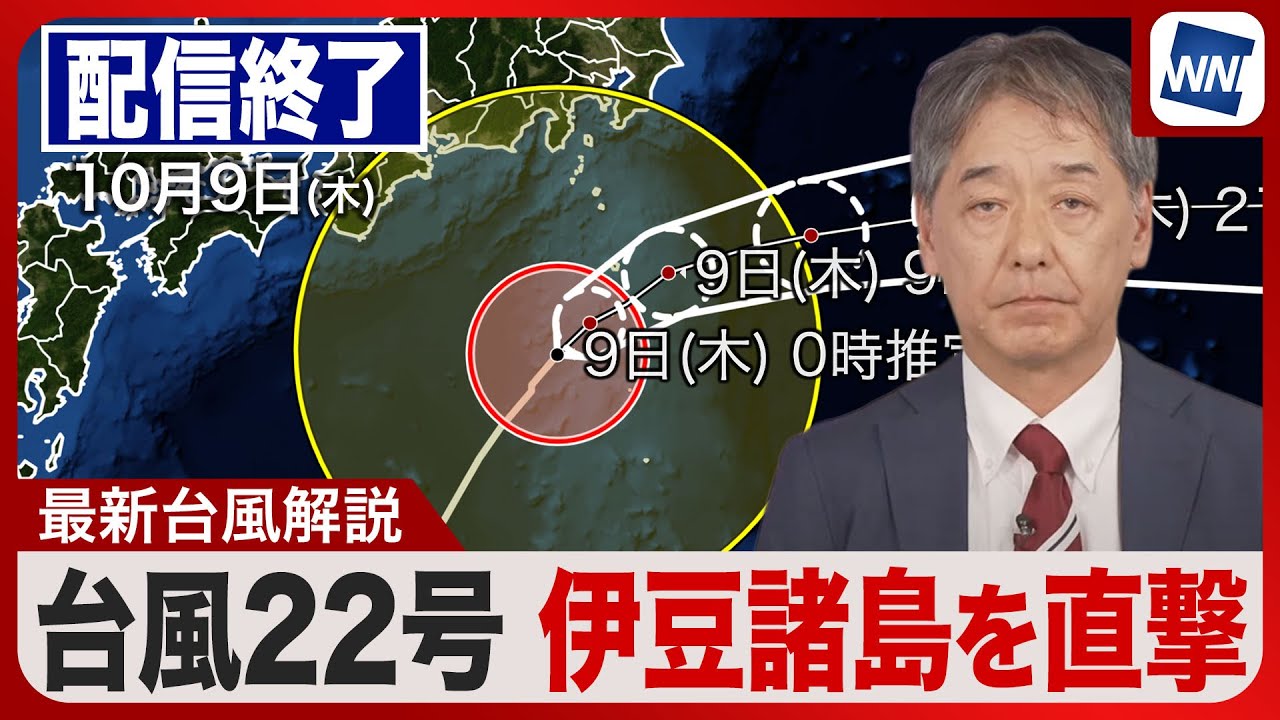 【ライブ番組終了】最新台風22号情報 ・地震ニュース 2025年10月8日(水) 23:00〜/9日(木)朝に伊豆諸島最接近 台風22号で伊豆諸島に暴風・波浪特別警報〈ウェザーニュースLiVE〉