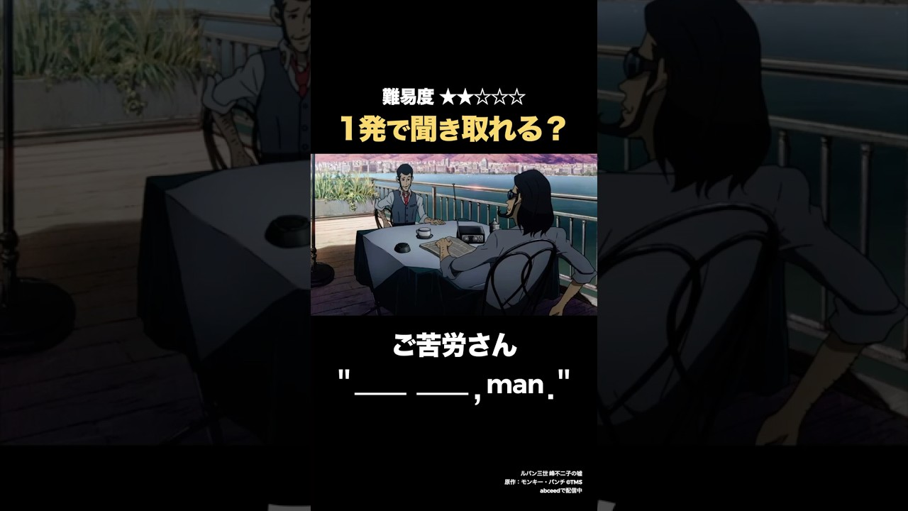 「ご苦労さん」の英語聞き取れる? ご苦労さんの英語聞き取れますか? 答えはnicegoingman。ナイス going man。ナイスゴはうまくやったね。いや、いいぞ。さすがと相手の行動や成果を称える時に使うカジュアルな表現です。 試験に合格した友達や難しい仕事を得た 同僚にご苦労さよくやったという ニュアンスで使われます。ではもう一度 リスニングしてみましょう。 ルパン三世 峰不二子の嘘 原作:モンキー・パンチ ©TMS abceedで配信中 animeアニメドラマアニメ洋画 英語字幕付き英語 リスニング英語 聞き流し英語学習