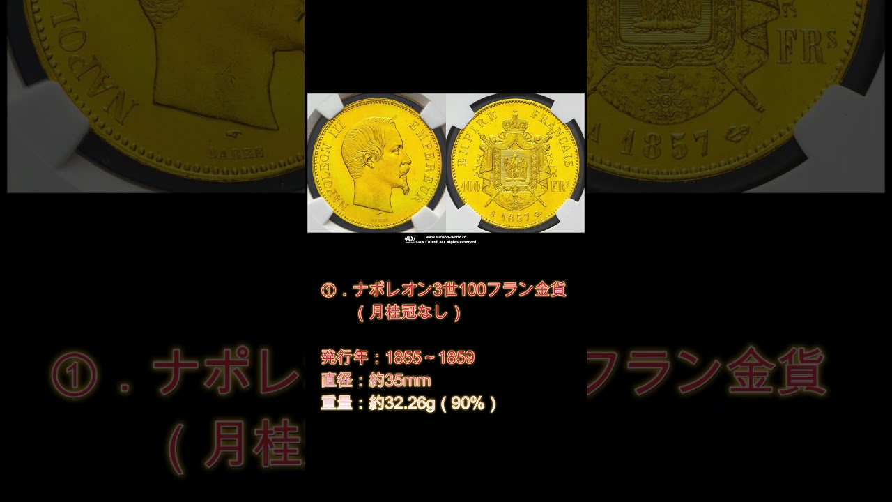 金貨格絶産上昇中ということで今回は大型 金貨の中でもジ金価格に近く買いやすい 金貨を紹介します。 今回は3枚全てフランスの金貨を紹介し ます。 1枚目はナポレオン賛成の100フラン 金貨で月計感なしのタイプのものです。 紹介する3枚の中だと1番安価に買えると 思います。 2枚目はナポレオン賛成の100フラン 金貨で月計感ありのタイプのものです。 紹介する3枚の中だと1番価格が高いと 思います。 3枚目はエンジェルの100フラン金貨 です。 先に紹介した2枚の中間価格だと思います 。 [音楽]