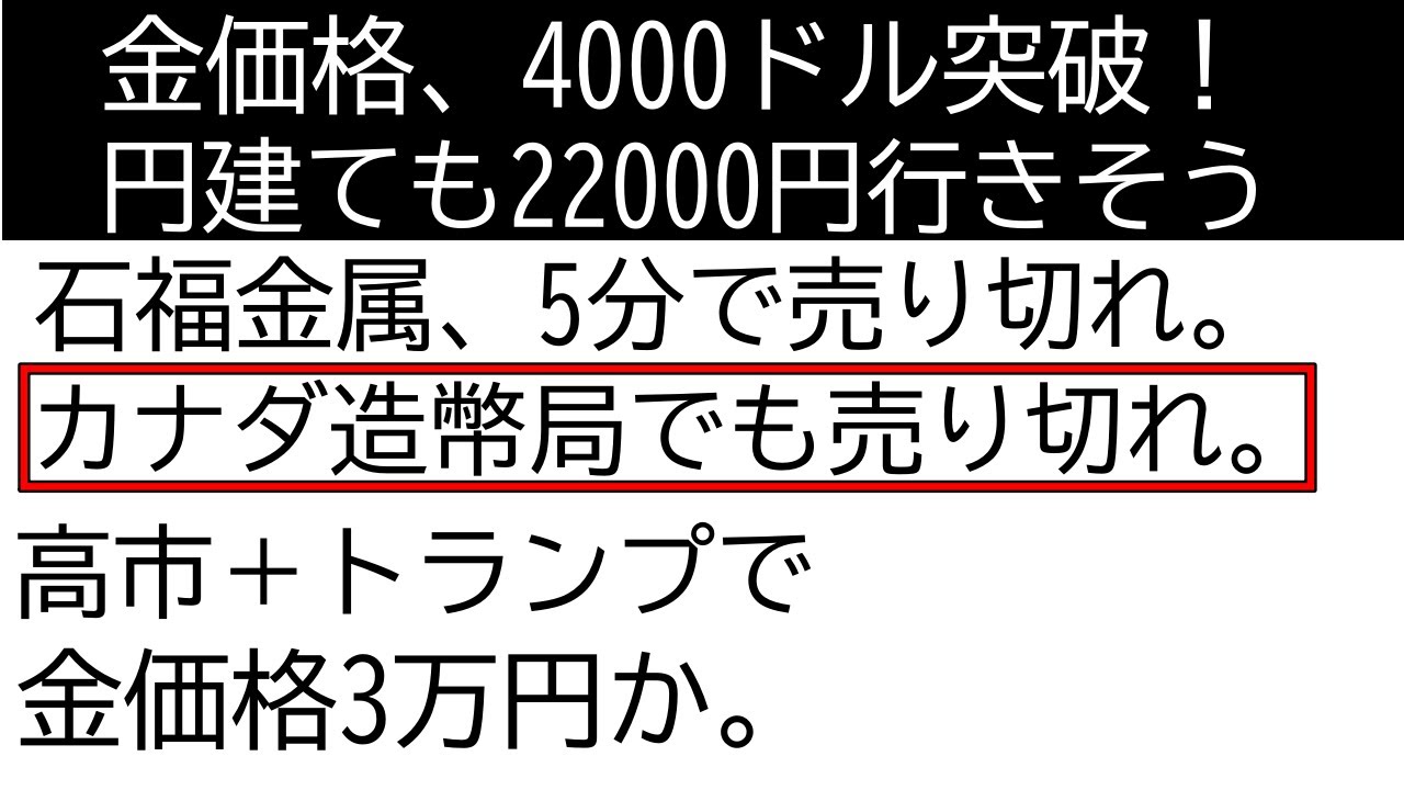 こんにちは。正です。ドル建て金価格が 4000ドル超えました。最高値更新です 。そして円立て金価格は2万1632円 と年始から6845円 上昇してます。そして円立てプラチナ価格 は8998円 と年始から3679円 上昇してます。本当すごいです。そして ドル円レートは高一さんが総裁になって から5円円安になってます。5円円安に なると円金価格は600円上昇します。 600円分は高一さんのおかげです。一方 でドル建ての上昇はトランプさんのおかげ です。今年の前半で言うとトランプ関税に よる混乱です。株価がグーンって暴落し ました。友人みたいなもんです。あとは ロシア、ウクライナ戦争です。先日の話に よると、トランプ大統領がウクライナに トマホークを供給するとこういう話になっ てるんです。むしろ悪化してるんです。 あとはFRBへの介入です。クックリジを 介するとか利下げをしろうとかこういう 介入です。いわゆる中央銀行の独立性が 脅やかされるっていう問題です。民主党 政権だったらパーウェル議長は利下げをし てないかもしれません。トランプ関税に よる物価の上昇を警戒してるからです。 ですからいろんな意味でFRB大丈夫、 パウエル大丈夫って心配して上がってる わけです。金価格はね。あとは細かい話で 言うとアメリカの政府機関が閉鎖してると これもあります。ですからざっくり言うと アメリカ大丈夫?ドル大丈夫と思って 上がってるわけです。金がね、もちろん円 もそうですよ。何回も言ってますけどね。 物価の上昇によって5年前の100万円が 今89万の価値しかないんです。さらに5 年後は80万ですか?75万ですか? 分かりませんけどね。その結果がこれなん です。売り切れです。金銀プラチナ全て 売り切れです。医種服さんですけど10時 から始まるんです。10時5分には小さい グラムが売り切れてました。5分です。 そして10時45分には全て売り切れです 。お店に行っても在庫はないんですかって 電話で聞いたんですけどないみたいです。 そしてカナダでも売り切れてます。 メイプルリーフ金貨を作っているカナダの 増局で売り切れてるんです。10g、 50g、100g、500g、1kg全て 売り切れです。買えません。ということで 以上ですけど、本当すごいですよね。今 までの常識が通用しません。3300ドル から1直線ですからね。調整来いよと思っ ても来ないんですよ。いや、3万円 行くんですかね?いつになるんですかね? 来年ですかね?本当怖いですよ。上がり すぎて。では以上です。ご視聴ありがとう ございました。