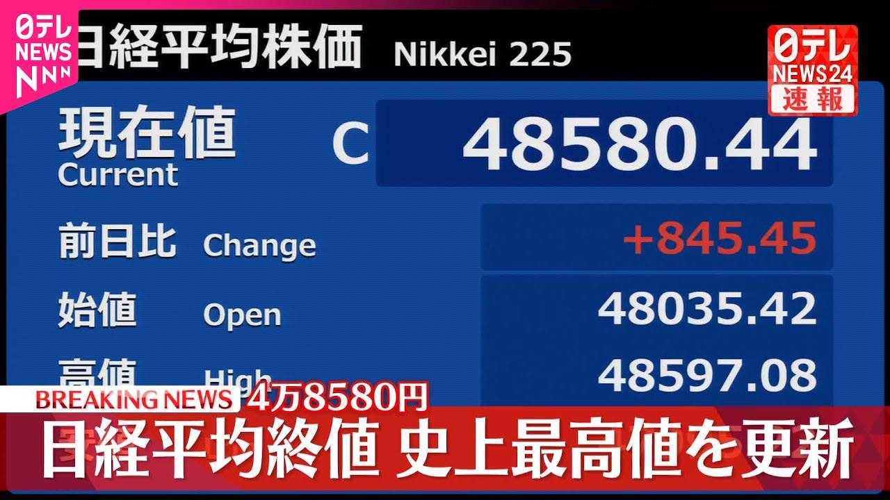 東京株式市場で日経平均株価は8日より845円高い4万8580円で9日の取引を終え、終値ベースでの史上最高値を更新しました。