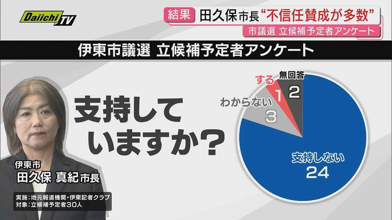 過去最多タイとなる30人が立候補を予定している静岡・伊東市議選。田久保市長の続投を支持するかが大きな争点となる中、報道機関のアンケートでは25人が不信任案に「賛成」すると回答しました。