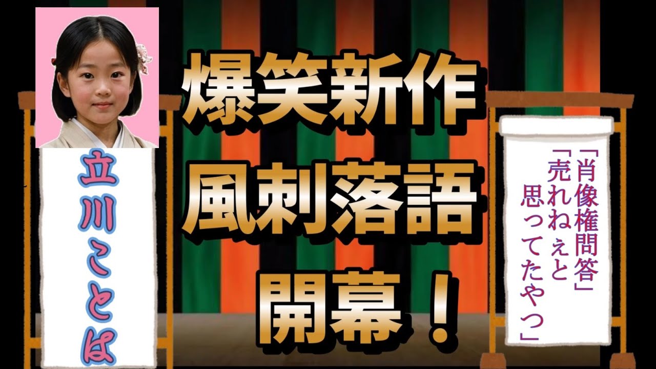 [音楽] [拍手] 肖権問答。え、どうもどうも。最近はね、 人の顔にも値段がつく時代でして、昔は顔 が売れてるなんて言葉は褒め言葉だったの に、今じゃ顔が勝手に売られてるって話が ある。便利な世の中になったけども勝手に 便利にされたらたまんない。いやね、ある 日芸人の山内さんがスマホ見てたらあれ ってなったんだそうです。自分の顔が 見覚えのない薬局の広告に出てる。 ダイエット商品ですよ。しかも構いたち 山内も愛用って書いてある。いやいや、 山内さん愛用どころか知らんがな。て変は そんなもんで山内さんあれこんなとこで俺 痩せたことになってると芸人がネタで太っ たり痩せたりするのはいいけど勝手に商売 に使われちゃ笑えないで吉本のホームが出 てきてオタクどういううちのタレントの顔 を使っとるんですかと薬局もいやちょっと 文言を変えたんで、政府かとってどこの ルールだよ。文言書いたら政府って泥棒が 今日からお借りしましたって言ってるんで 犯罪じゃないですようなもんだ。しかもね 、その薬局よりによってダイエット商品に 山内さんを使った。相方の浜が行ったん ですよ。なんでよりによって山内やねん。 中村安さんとかなら分かるけどって。 これがまた的確。世の中には肖像権以前に イメージの敵材的ってもんがある。そりゃ 山内さんも起こりますよ。中村あんなら 使わへんくせに俺ならええやろって思っ てるやろって。そうそう。これが日本人の 悪い癖。まあこの人なら怒らないだろうっ て線引きが甘いんです。芸人だから笑って 済ませてくれると思ったんでしょうけど、 芸人の顔だって商売道具です。包丁職人の は勝手に使うようなもんですよ。で、これ がすごいのは吉本のホームが動いたって とこですよ。普段芸人のトーク番組のノり でうちのマネージャーがっていうのは聞く けど、ホームが動いたってのはなかなか 聞かない。いかにも吉本が本気出したって 感じ。もうホームが歩くだけでBGMに ドンドンってなってそうだね。でもね、 この話ただの肖像権の問題にとまらない。 現代のガルさんの象徴でもあると思うん ですよ。写真も言葉もコピペッ感覚で使う 。昔は看板絵描くにも職人が1匹ずつ描い てたんですよ。今はAIがパッと作る。 本人の許可取りました?って聞いたら、え 、ネットにありましたよって。いや、 ネットは許可症じゃない。勝手に載せて 勝手に宣伝。こういうのがまかり通るのは 便利の代償です。便利になるほど人は めんどくさいことご視する。確認、連絡、 許可全部すっ飛ばしてこれくらいならいい でしょの連続で面白いのはね、浜が山内 使っても売れへんでって言ったとこ。あれ 通列ですよ。つまり売る気があるのか 疑わしいって。もしかしてその薬局本気で 売りたくなかったのかもしれない。逆に うちの商品うさ臭く見せたいってなら天才 ですよ。広告としては。でもそれを逆手に とってタレントの顔を無断使用したらこう なりますよと。山内さんが全国ネットで 話した時点でその薬局全国の反面教師です よ。まさに笑いで殴る制裁。男子師匠なら こいうでしょうね。バカ野郎。笑いにし ちまった時点でお前の勝ちだよ。そう。 怒りを笑いに変えるってのは芸の極み。 怒りのエネルギーをそのまま放つと喧嘩に なる。でも笑いに変えたら人を動かせる。 薬局だって今頃やべえ。公務部も怖いけど 世間の笑いがもっと怖いって思ってるはず 。ただね、これ他人ごとじゃない。俺たち もSNSで勝手に写真載せてる。この人と 飲みましたって。相手がえ、供給身って嘘 ついたのにてなったらそれも一種の肖像権 侵害です。だからね権ってのは芸能人だけ の問題じゃない。 人の顔に許可という見えない寝札が ぶら下がってる。結局のところ世の中顔の 使い方が雑になってるんですよ。昔の人は 顔を立てる、顔を潰すなんて言ったもん です。今は顔を拡散する。いい加減に しろっての。で、最後に1つ。もし次に誰 かが俺の顔を勝手に広告に使ったらそりゃ もう訴えないですよ。むしろ自分で 書き換えてやりますよ。この商品使って ません。でも聞くかもしれません。でね、 これが現代の落語化の生き方。怒るより 笑いで返す。だってね、笑いってのは人の 顔を救う唯一の権利だから。 お後がよろしいようで2幕目売れねえと 思ってたやつ。いやあ、世の中ってのは 分からねえもんだよな。だってよ誰が ハリウッド師匠が売れるなんて思ってた。 あの全身タツみたいな体でもまねとか言っ てるおっさんだぜ。普通なら コンプライアンスのゴミ箱に投げ込まれて 終わりだ。 今回の話の発端は剣道小林。けこばが言っ てんだよ。雑魚師匠は無理やろなと。おい 、そこみんな思ってた顔すんな。あんたも 思ってたろ。俺だって思ってたよ。いや、 思ってたっていうか売れるって言葉の意味 がどんどんわかんなくなってんのよ。昔は よ、売れるってのはちゃんとした芸をやる やのことを言った。話ゲーなら落語、漫