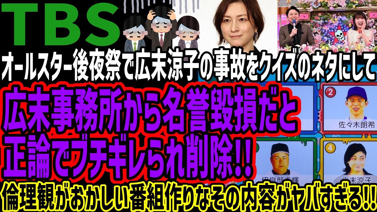 【TBS】オールスター後夜祭で広末涼子の事故をクイズのネタにして広末事務所から名誉毀損だと正論でブチギレられ削除!!倫理観がおかしい番組作りなその内容がヤバすぎる!!