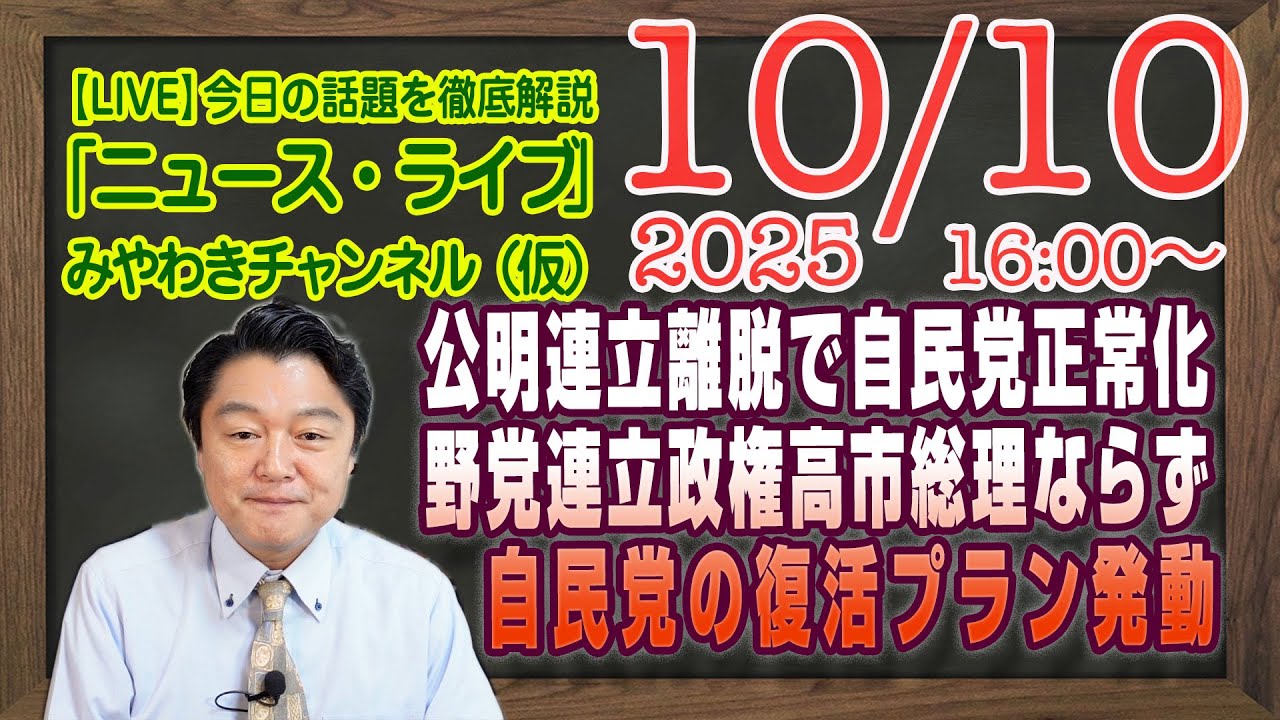 【LIVE】公明連立離脱で自民党正常化。野党連立政権で高市早苗総理ならず。最強の自民党の復活プラン発動|メルマガ「雑談回」「みやチャン・ニュース・ライブ」(令和7年10月10日 16:00分〜)