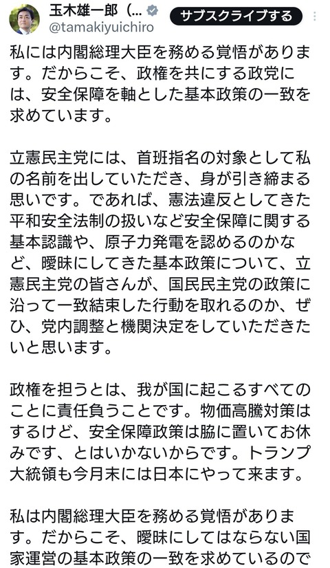 私には内閣総理大臣を務める覚悟があります。— 玉木雄一郎 (@tamakiyuichiro) October 10, 2025