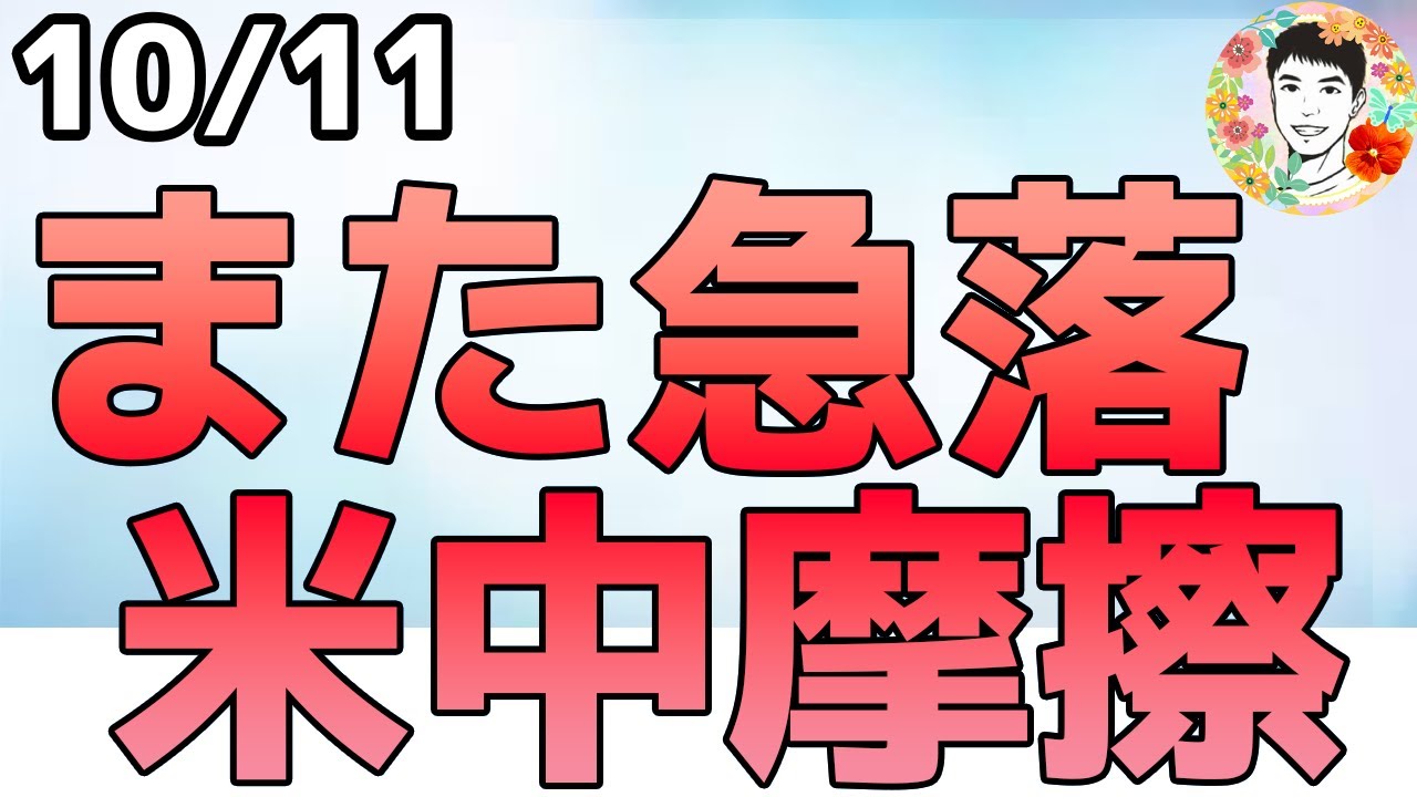 おはげございます。10月10日金曜日の 米国株場が閉まりました。このチャンネル は毎朝マーケットが閉まった直後に速報 動画としてお届けしてます。朝一で最新の 情報を知りたいよという方は是非 チャンネル登録をよろしくお願いします。 さて今日は大幅下落してしまいました。 トランプ大統領が中国製品へ完税を大幅に 引き上げる。として集金国家主席との会談 をキャンセルすると発言したことによって 一気に下落しました。しかしこれは経済に あまり大きな影響を与えない絶妙の タイミングでトランプ大統領が行ったん じゃないかなと思ってます。それは後ほど お話ししていきます。指数見ていくと ニューヨークダウン-1.9% 4万5479.6 S&P500-2.71% 6552.51 NDA-3.56% 2万2204.43 ラッセル2000-3.01% 2394.59 です。原油-4.34% 1バレル58.84ドルゴールド +1.33% 4025.4ドルドル円 151円62000仮想通貨ビットコイン が11万6800ドル イーサリアム4000ドルです。国際の 利回り見ていくと10年祭が4.062、 2年祭が3.529ということで一気に 利回り下落しました。ということは債権が 変われたということですね。債権利回りの チャート見ていくと23時55分この辺り から急落しています。そして、え、サンド P500もプレマーケットその後も順調 だったんですがトランプさんの一言で急落 しています。そのまま引けにかけても続落 。冷足チャートで見るとめちゃくちゃ 大きな大陰線ですね。9月中旬からの上昇 というのを一気に全て吹き飛ばしてしまい ました。そして緑の50日移動平均線 ぐらいまで下落。ここが会場となるのか、 それとも暴落の始まりなのか。999も 出来高を伴って大きく下落しています。 ヒートマップ見ていくと久しぶりに濃い赤 ばっかりですね。NVDIA-4.95% 、ブロードコム-5.9%、ここ最近好調 だったAMD-7.8% 、その他大型テックもAmazonテスラ は5%以上の下落。AppleMAは3% 以上の下落。Microsoft Googleは2%前後の下落です。最近 話題だったネオクラウド銘柄アイレン -6.3% 、ネビウス-2.3%、コアウブ -3.2% と下げていますが、それでもまだまだ高値 件ですよね。そして原子力関連ではオが プラ6.5%と上昇しています。ただ ニュースケールパワーは-3.3% 、コンステレーションエナジーは -3.8% 。逆にエナジーフュエルウラン関連は+ 3.25%と上昇です。そして電力 Gベルノovバ-4.6% ピストラ-6.2% 仮想通貨関連ロビンフッド-8.8% コインベース-7.7% マイニング関連はサイファーマイニング -5.6%ビットファs プラ0.72%。ま、両方とも高値県では あります。そして量子コンピューターiq -8.8% リジッティ-6.7% 。早い段階から投資してる人にとっては まだまだ含みはたんまりですね。そして 宇宙ロケットラブが-3.2%、アストラ スペース-5.5%。ま、こういう風に 一気に大きな下落来ると心配になる方も 多いかと思います。ただ4月の完税発動し た時点の大きな下落からも復活してるので 僕は短期的な動きに惑わされない方がいい かなとは思いますけどね。ではニュースを 見ていきます。トランプ大統領中国の国家 主席と会談する理由はない。そして完税を 大幅に引き上げると警告をしました。その 理由はレアースに関する中国の敵体的な 輸出規制ということで昨日ですね、採掘や 精錬に必要な技術の輸出を規制すると中国 が発表しました。Apexでトランプ 大統領との階談を前にアメリカに揺さぶり をかけてるのではないかということでした が、それにトランプ大統領は激怒大幅な 完税引き上げその他にも複数の対抗措置を 真剣に検討しているということです。ただ この発表が仕まれたタイミング消費には そんなに影響ないかもしれないというのが こちらの投稿アジポンさんですね。急に 再開したかに見える米中貿易摩擦ですが、 実は8月から9月にアメリカから中国に クリスマス小鮮用の注文が殺頭していまし た。ということでアメリカでは10月の ハロウィン、11月のサンクスギビング、 そして12月からのクリスマス商期大量に 中国から物を輸入します。なのでその前に 完税が上がってしまうと商品の値上がりが すごいことになってしまうんですが、 すでに輸入していて在庫がいっぱいあると いう状況であれば、今から完税引き上げを してもクリスマス朝鮮にはその影響が出 ないのではないかというタイミングだった のかもしれません。そして中国はアメリカ の船に対しても中国の港による際に特別 料金を貸す方針を明らかにした。ほ、反動 体手クアルコムがイスラエルの オートトークスを買収することに関して 競争法上の調査に着手したということで クアルコムの株価も下げています。で、 これはイスラエルとイスラム組織ハマスの 和兵合意を祝うために中東訪問を予定して いるタイミングで中国からの所管が届いた ということに対しトランプ大統領はとても 不快感を表明しています。この日がまさに 3000年に及ぶ混乱と戦いの末に中東に 平和が訪れた日だったから不適切だと。逆 に中国としてはいつこういったことを発表 するかという機会を伺っていたのではない 