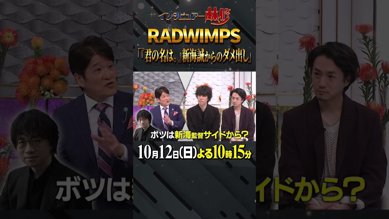 レベルの高いものを深海さんは丁寧にボツを出してくるんですね。 [笑い] それはそれは丁寧にね。 はい。 [音楽] インタビューは林さにダッドビンクスが登場。ヒ 大ヒット映画君の名の全ての楽曲を制作したラッドウィンプスだが 監督深海誠と共に作り上げた制作費和があった。 主題4局にそれからその 22局たら26局も作られたんです。 はい。 はい。 そっか。 ボツ入れたら多分ね。 うん。67局は作ってると思います。 え、ボツは深海サイドから来るんですか? はい。 あんなにお優しい深海誠は映画に関しては本当にドライで [笑い] ただとっても調なあの文面を全部是非見て欲しいっていうかあ 1 回ちゃんと褒めてくれるんだよね。 ものすごい褒めてくださるの。最初の 4行ぐらいで。 はい。はい。はい。 その後なぜかを 18行ぐらい。 なるほど。ちゃんとしたレベルの高いものを深海さんは丁寧にボツを出してくるんですね。 [笑い] それはそれは丁寧にね。 はい。10 ヶ月ぐらい音楽を当てながら 1 回もその完成の映像を見ることなく作ってたのでただ本当にガムシラに深海さんを信じて作るしかないなと思って。 あの、スパークルのシーンとかもね、もう感想何分にしてくださいとか えって思いながら そういう指定があったんですか? そうです。そうです。 へえ。 その僕らが単純にあの深海誠って人に惚れ込んでいるところもあるのでやっぱり、ま、好きな人を喜ばしたいっていうような気持ちもあるしすごくいいです。 ダウプスの音楽にかける思いを惜しみなく届ける 1時間は日曜夜 10時15分からの厚み