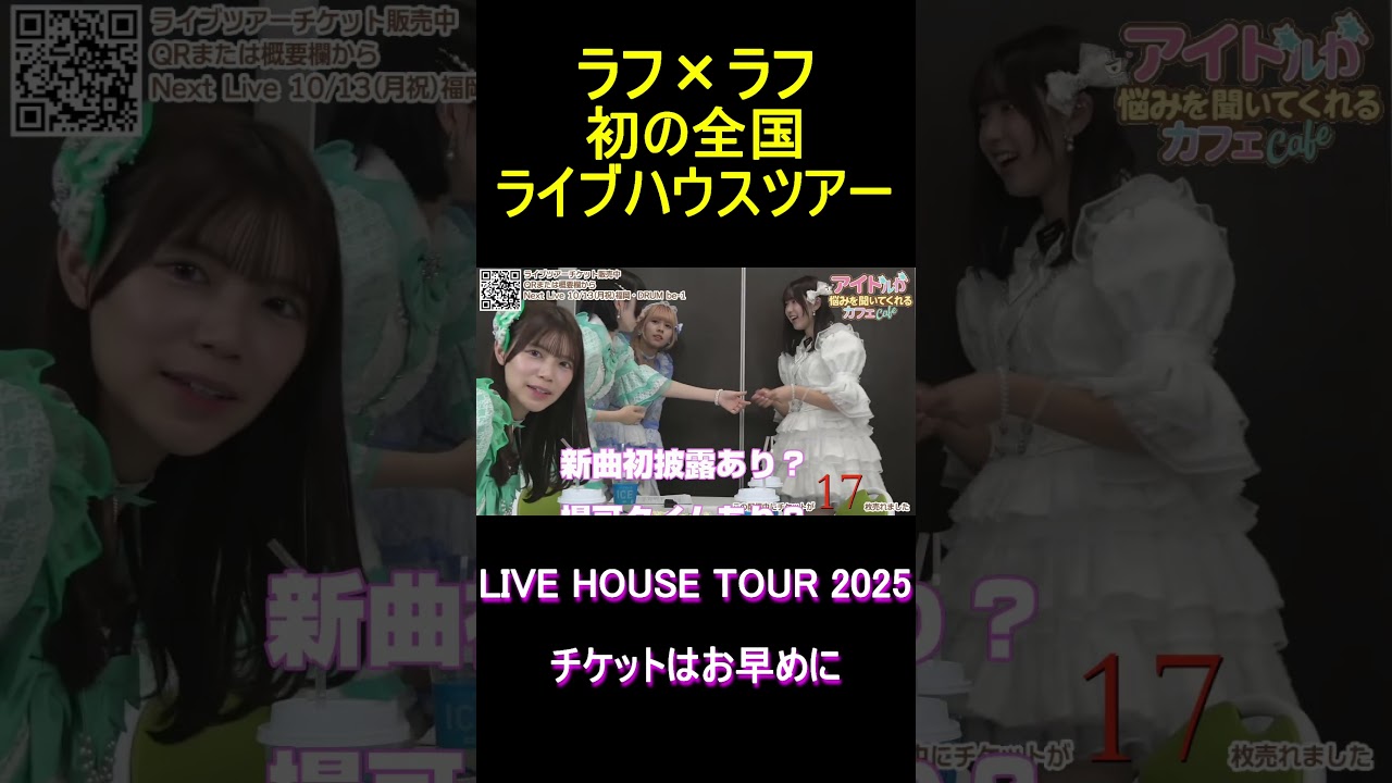 来週からラフラフ全国ライブハウスツアが始まります。 イエイ。 みんなね、直接見たら何十倍も可愛い。本当に。 そう。本当にYouTubeの動画よりも SNS に乗ってる写真よりもアーシよりも実物の方が多分可い。可いい。 びっくりすると思う。 うん。 みんななんか細いし、顔ちっちゃいし、なんかびっくりする。本当に 芸能人だなって。 お客様がラフラフのツアーに来たくなるようにおじいをかけてもいいですか?それでは一緒にお願いします。ライブに来たくなれ。萌え萌えキん。 ショートコント初めての得典握手会。 えっと新規なんですけどあのどっちも使えますか? え、じゃあどうしようかな。ツショット。ツショットでお願いします。 あ、初めまして。あ、初めまして。え、初めて来てくれた。え、嬉しい。 ね、ステージから見えてて嬉しい。え、反送したから来てくれた。もしかしてました。あ、すいません。すいません。あ、 なんかおすすめとかありますか?い、ハート。 321 かし。 ありがとう。ありがとね。本当に途中から可愛いなと思って青ので、え、これからも応援しました。ありがたい。ありがとう。あり。 だって絶対みんな可愛いしもっと好きになるよ。じゃあ手繋いであげるけん一緒に行こう。ほら行くよ。お帰りなさいませ。ごちご主人様にゃんにゃん。せーの萌え萌えきん。 あ、絶対来てにゃん。 萌え萌えにゃん。 ありがとうございます。 絶対来てね。 本当にお願いします。 はい、ということでまずは来週の福岡でお会いしましょう。ありがとうございました。 待ってよ。
