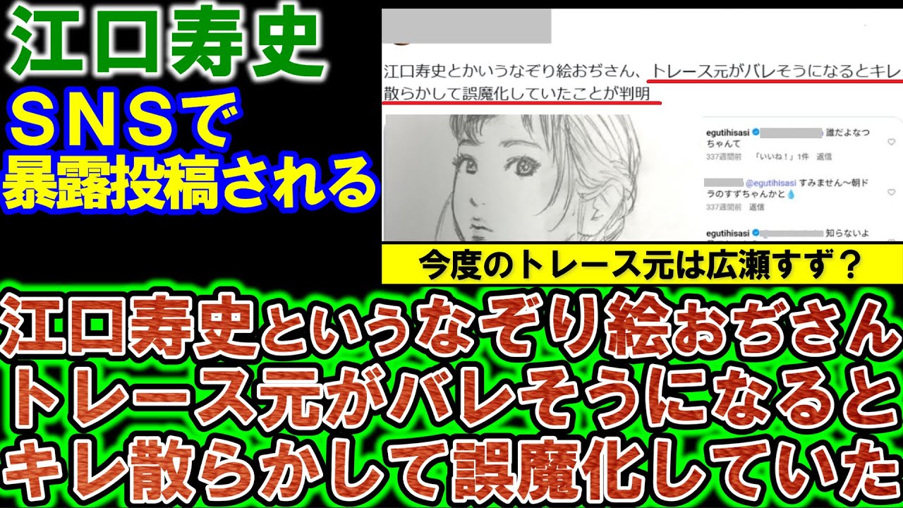 今回はあの江口久しが SNS 上でトレース元を指摘されたら切れ散らかしたという Xユーザーの投稿を紹介するぜ。 トレース元を指摘されたくらいで切れ散らかすなんて。だったら江口久しは連日トレパく検証されているから今の江口久しは怒りまくって収まりがつかないんじゃないかしら。 今回話題になっているのは XTwitter でこのような投稿があった。 江口久しとかゆう名ぞりおじさんトレース元がバレそうになると切れ散らかしてごまかしていたことが判明 という投稿だった。 これはまたインパクトのある投稿ね。 で、この投稿にはこのような画像が添付されていた。 あら、この三網の女性は誰なのかしら? これは2019年にNHK で放送された朝ドラの夏で主演を務めた広瀬鈴さんのイラストと思われる。 最もこのイラストは商用利用されたわけでもないし、広告イラストに使用されたわけでもないだろうから特に問題はないんだ。ただトレース元が指摘された際の江口久しの対応が話題となった。 江口市はどのような対応を見せたのかしら。 なおこの時の対応について X の投稿者は添付画像でこのように説明しているんだ。 インスタの三網女の子の絵にコメントしたことがあるんです。 当時江口先生が広瀬姉妹を書いてたのを 知っていたし、夏空をやってた頃だったの で可愛いナツちゃんですねと。そしたら ナつちゃんって誰だよとごめんなさい夏空 の広瀬すずちゃんかと思いましたと言うと 知らねえよに決めんなと返信が怖くなって フォローやめちゃいました。ちょっと 間違えられるだけであんなに怒る方なんだ 。 自分の作品は大事だもんなと思っていたら江口先生からトレースだったんですね。いや、トレース自体は別にいいのかと一連のやり取りを説明しているんだ。 すごい対応ね。 でもな、この添付画像の説明は若干話が盛られているようなんだ。それというのも実際の X でのやり取りも画像が添えられていて実際のやり取りはこのような感じだった。 ナつちゃんですね。 誰だよなちゃんって。 すみません。朝ドラのナちゃんかと 知らないよ。見てないから。 勘違い本当にすみません。あら、最初に説明していた。知らねえよ。勝手に決めんなとは言っていないじゃない。 ああ、実際話がられている件について他の X ユーザーからこのように指摘されているんだ。 絵口久差しが良くないのはもちろんだが投稿者もナツちゃんですね。なのに可愛いなちゃんですね。知らないよ。 見てないからなのに知らねえよ。勝手に決めんなって思っててよくない って話を持っていることを注意しているんだ。 確かにこれは話を持った感じもあるわね。 また別の話になるけど昨年 9月にはX で江口さんを意識してイラストを書いたというユーザーがいたんだ。 へえ。江口氏のイラストを模したのかな?江口氏のファンだったんでしょうね。 ところがこのX ユーザーは少し江口久しさのイラストとして投稿したらしく、これに江口氏が反応してこのようにコメントしたというんだ。 少し江口久しさん長じゃなくはっきりと俺の絵の模者でしょう。模者はあくまで模者であってあなたの作品ではないからね。 先生のイラストを模させていただきました。ちゃんとハッシュタグで記載せずすみません。として江口久しは不快感を示したと言うんだ。 江口久しは自分の作品が真似されることは嫌なのね。 このような江口久しの対応について SNSではこのような声が出ているんだ。 模者はあくまで模者であってあなたの作品じゃないからね。これすごいブーメランだな。俺はいいけどお前はダメっていう性格。 確かこの人イラストは 1枚書けば10 万入る美味しい仕事とか言って漫画を書くのやめたんですよね。本人昔そんなこと漫画の中で語ってましたよ。 広瀬鈴のトレース元についてだけど、これ は別に商用利用してるわけでもなかったん だし、普通に返信 態度がやばすぎる。やっぱなんでもない ようなことに切れてくるやつ何かしらやっ てるよな。浮気ばれるかもと思切れして くる男みたいな などか厳しい意見 を向けられることとなったんだ。まあ SNSでトレパク検証するような画像が 出回るようじゃね。 それでは今回のニュースはこれで終わりとなります。 最後までご視聴ありがとうございました。 高評価やチャンネル登録をよろしくお願いします。