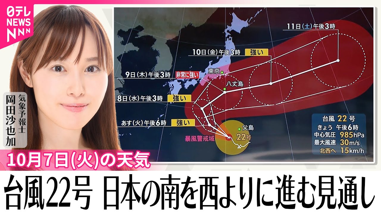 小笠原近海にある台風22号は、7日(火)にかけて発達しながら日本の南を西よりに進む見通しです。その後は北上して、9日(木)頃は伊豆諸島に接近しそうです。非常に強い勢力での接近となりそうですので、伊豆諸島では早めの備えをお願いします。また、進路によっては9日(木)頃、関東や東海の天気にも影響が出るおそれがあります。今後も最新の情報にご注ください。