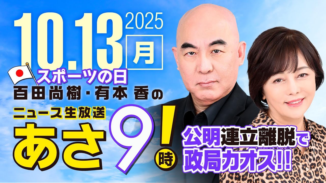 おはようございます。立ポ9時です。令和 7年10月13日月曜日ニュース放送朝 今朝9時スタートです。え、月曜日と言い ましてもですね、今日はスポーツの日って 言うんですかね。 今スポーツの日って言うんですか?あの渡辺さん みたいですね。カレンダーにはスポーツの日な んで体育の日じゃ行けないですかね? 謎ねえ。別に体育の日で良かったじゃんと思うんですけど、なんでスポーツの日って言い換えなきゃいけないんですかね?変な話ですね。ま、ということでですね、今日は百太さんとお送りしようと思うわけなんですけれども、ちょっと百太さんの方がまだ繋がっておりません。 ちょっと待ってくださいよ。いや、それにしても急に涼しくなったね、ここんとこ数日。 そうですね。 ねえ。ま、やっぱり当たり前ですけども、秋ですからね。はい。 さて、あの、ま、そのスポーツの日って いうことなんですけれども、今日の サムネールに書いてありますけど、なんか こう正極が根鳴してるんだという、そう いう手なんですけど、公明離脱、連立離脱 で正極カオスと、ま、こういうことなん ですけどね。ま、実際カオスなのかな。ま 、私たちは日本保守島の人間たちはですね 、あの、全くそういうことに影響受けない 形で、え、やってますというのも、おっと 、ま、もちろんね、あの、弱闘だからって いうこともあるんですけれども、とにかく 自分たちの今やるべきことをやるしかない わけで、まあ、別に公明党がどうしたとか ですね、あんまり関係ないかなと。で、 むしろね、えっと、公明党と自民党の連立 があの壊れるっていうことは日本のために はいいことだろうという風に思っています ね。ただおそらくその自民党の関係者の 方々あとかま米と支者の一部はですね、 ギャーっとこう言ってるわけですけれど、 あのそんなのはね、はっきり言て一部の人 の、ま、コップの中の嵐ですよ。大型のね 、あと日本人、日本国はほとんど関係なく 日常生活を送ってます。 ちょっと待ってくださいね。今ちょっと 繋ぎますね。 はい。あ、おはようござい。ちょっと待っ てくださいね。ちょっとダさん、ちょっと 待ってください。ちょっとまだこれが消え ておりません。はい、どうぞ。 ありがとな顔が見えません。 え、本当?ちょっと待ってください。何でしょうね。これね、カメラがね、最近ね、ちょっと変なんですよ。はい。 いやいや、あの、角度、角度。あ、 はい。どうも。はい。どうも。ありがとうございます。では、ど、あ、ちょっと待ってください。百太さんと。はい、繋ぎました。おはようございます。 やれやれ。百さん少しは、あ、連休百太さん大掃除してたんですよね。 はい。全然終わりませんね。 全然終わりませんね。 だって途中で本読んだりしてるんですもん。 はい。大変ですね。 それって片付けが進まない典型的な行動ですよね。 そういうことですね。 で、あれなんですか?お家の中で百太さんの部屋だけ片付いてないと。 いや、他の部屋も片付いてない。他の部屋は嫁さんが 1でもやってくれとるけど。 なるほど。そうですか。 はい。 分かりました。 僕の部屋が1番大変なんです。 僕の部屋が1番大変なんですね。 なるほど。なるほど。 わかりましたよ。はい。それではですね、あの、今ちょうど話してたんですけど、今日はね、 スポーツの日って言うんでそうです。我々昔は体育の日って言ってたんですけど、なんでいちいちそれをスポーツって言い換えたのか意味が分かりません。 まあ、あれやね、外国人がたくさんやってくと思ったから 関係でもね、例えばじゃ、外国人の感覚で言ってですよ。お、今日はナショナルホリデーだと何の日って言ってスポーツデイって言ったらそれはそれでえってなりますよ。 まあね、ま、元々元体育の日でもそうやけどね。 まあ、まあ、そりゃそうですけどね。うん。 ま、あの、若い人はなんか分からへんと思いますけど、これはですね、え、日本で初めて昭和 30 億年に、え、東京オリンピックは開かれた同年、この開会式の日を、ま、体育の日という風に、ま、しましたですからですね、その大会、開会式は 10月の10日なんで、だから 10月の10日が正しいですよね。 そうなんですね。 はい。13 日いうのはおかしいですね。はい。これ大会 3日目ですからね、これは。うん。 はい。 で、つぞやからそのハッピーマンデーだとか言ってね、え、土日つけて月曜日を休みにすると。そうするとみんながゆっくり連休で休めるって、ま、こんな話になってきたんですけど、 私もね、2 度目のその東京オリンピックやったんだから、もうそろそろこの元々の体育の日は祝実である必要があるんだろうかという感じもするんですよね。 あの、これ言うとちょっと多くの人から、あの、また怒られるかもしれませんけど、 え、何? 私はね、むやに作るっての反対なんですよ。 ああ、そうですね。 というのはね、 うん。 民間は 働いて金を設けてるわけ
