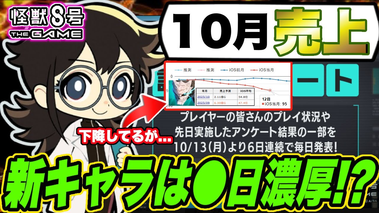 皆さん、こんにちは。アサ雨です。怪獣8 時の攻略動画ライブ配信をあげてますので 、チャンネル登録よろしくお願いします。 今回は今日までの今日時点までの10月の 売上とそしてですね、Xのポストから予想 される新キャラクターの実装備日や コンテンツの追加などを予想していきたい と思います。まずですね、10月の売上の 推移、iOSの売上の推移がこちらとなっ ております。現在時点10月12日、12 時点でこちらの順位100位となっており ますね。iOSは、ま、1番最初10月1 日の時点では88、そこから新 キャラクターの実装によって20代まで 上がったんですけども、そこからゆるゆる と、ま、下がってきている感じでした。で 、50以台ぐらいまでずっとね、安定して いたんですけども、10月10日前後から かな、60代ぐらいまで落ちまして、そっ からね、ずるズる70、80、90、ま、 現地点で100位まで落ちてます。ま、 これはね、しょうがないことだと思う。 こうなることは予想してました。むしろ 50以来でよく安定してたなって思ったん ですけど、ま、新キャラクター2体実装し て、ま、そっからね、コンテンツが やっぱりなかったってところが、ま、1番 の原因かな。で、今回大規模制圧戦が実装 されて、ま、コンテンツの中身自体は多分 ね、Xの投稿でもすごく多かったんです けど、中身自体はすごく面白い、ちゃんと しっかり作られてるものですごく爽快感が あって面白かったんですけど、やっぱり ですね、結構リリースからやってる人とか からすると攻略が簡単なんですよね。ま、 すぐ終わっちゃったっていうのも事実です 。だからもう少しね、なんか小刻みにして も良かったんじゃないかなと個人的には 思ってます。例えば今回の大規模制線3つ しかステージなかったんですけど、ま、1 日に進めるステージをね、1つとか2つと かに絞っていくとか、ま、それだけでも ちょっと変わったと思いますし、もしくは 、ま、この討伐数50体であればね、星3 クリア可能なんですけど、もう討伐 数マックスまでクリアすると勲章が もらえるみたいな、なんかそういった コンテンツというか、そういう報酬みたい なのも追加であったら嬉しかったかなと 思います。ま、ここら辺は今回は多分ね、 βタ版としてやってると思うし、ま、新規 ユーザーとかも追いつけるように作ってる と思うので、ま、ここら辺はね、今後 手こ入れしていくんじゃないかなと思い ます。で、私が1番嬉しかったのは、ま、 売上がね、コンテンツ不足で落ちるって ところは本当ね、ま、予想できたところだ し、ま、なんとかして欲しいなと思ったん ですけど、Xのポストでですね、今日の 12時にポストがあったんですけど、 お好み好みの怪獣8時レポート、これが ですね、明日から6日間、月曜日から6 日間ですね、ゲームのプレイ実況や アンケート結果の一部をお好み好みが紹介 ということで、ま、現ユーザーのね、全 プレイヤーの現在の状況とか、あとは前回 実施し9月中ですかね、実施したユーザー アンケート結果の一部を10月13日より 、ま、6日連続で毎日発表してくれると いうことなので、ま、これでね、エゴさと かもしっかりしてくれてるし、ま、前回の アンケート結構生かして今後どういう風に ゲームを作っていくかを発表していきます よっていうことを、ま、もうXの方で ちゃんとね、しっかりと公式が報告して くれてるってことなんですよ。これって めちゃくちゃ嬉しいことで、しかも 動き出しもすごい早いじゃないですか。8 月31日にスタートして、ま、初動は結構 ね、良好でした。でもそっからやっぱり1 ヶ月経ってコンテンツ不足でその間に ちゃんとユーザーアンケートを取って、 ユーザーがね、どこを今不満に思ってるか とか、どこを改善して欲しいかってところ をしっかりとアンケートを取って、それを ね、しっかりみんなにプレイヤーに開示し ていくっていうのはこ運営として めちゃくちゃね、めちゃくちゃ信頼できる 動きですよ。これはこんだけユーザーに 寄り添ってくれてるゲームなかなかないと 。他のね、単性コマンドRPGとかいくつ もやってきましたけど、ここまでちゃんと 考えてくれてるのはね、めちゃくちゃ 嬉しい。もちろん運営が1番今コンテンツ が不足してるし、ユーザーが退屈してるし 、ま、売上も落ちちゃう期間だっていうの もちゃんとね、もうしっかりと把握した上 で、その上でアンケート結果とかをね、 今後に生かしてくれるってことだと思い ますので、ま、そこら辺はね、すごく信頼 できる運営さんなんじゃないかなと思い ます。そしてここから分かるのはですね、 明日から6日間おぎがね、このプレイ実況 とかアンケート結果の一部を公表してい くっていうことは新キャラクターの実装は 、ま、20日が1番濃厚ですね。15日 から育成支援キャンペーンがね、第1弾が 、ま、実装されるんですけど、ま、そこに 合わせることはないかな。で、他に コンテンツもないしね、今のところ。ま