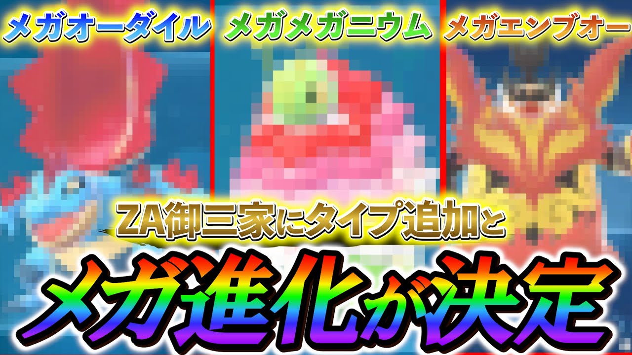 皆さんどうもポケモーニングポケモン情報 局のひとです。以前お話しさせていただい た通り、え、私ひとちょっとね、喉の調子 が悪くてお休みをいいてたんですけれども 、ま、Z発売ギリギリまで休んでいた おかげでだいぶ体調回復しましたので、 今日からまたZAについての最新情報お 話ししていきたいと思います。よろしくお 願いします。え、それでは早速Zの情報 やっていきましょう。ということでまずは こちらからです。先ほどポケモン公式 Twitterさんより ポケモンレジェンズZのランクバトルの 情報について発表がありました。ランク バトルシーズン1は10月16日発売当日 から開催が決定しておりまして、発売日の 15時から、え、参加することができます 。4人の通信対戦で、え、リアルタイムな 戦闘を楽しもうという、え、ポケモンZ バトルクラブのバトルシステムを用いた ランクバトルですね。ランクアップ報酬で は月光がナイトがもらえるということで、 え、これを月光画に持たせることでメガ 月光画にメガ進化することができます。な のでポケモンレジェンズZが発売して クリアしたらまず最初にこのランクバトル に参加して、え、月行がないを手に入れ るっていうのが最初にすべきこと、え、Z クリア後にすべきことなんじゃないかなと 思います。え、またランクバトル、ま、別 に、え、Zのストーリー全部クリアして なくても、ま、2時間か3時間ぐらい遊ん だら参加できるようになると思いますので 、ま、早めに月光がないと欲しい方は、え 、ランクバトルちょっとだけ遊んで月が ないともらうっていう、え、楽しみ方も ありなんじゃないかなと思いますね。続き まして、現在ポケモン公式YouTube チャンネルではポケモンレジェンズZAで 新しく登場するメガ進化ポケモンが たくさん紹介されていると思うんです けれども、え、現在海外の情報とか噂とか でですね、最初に選ぶご3家、え、 チコリータ、ポカブ、ワニノコ、この3体 の最終進化であるメガニウム、オーダイル 、エンブをこの3体もメガ進化してメガニ メガ、メガニウム、メメガオーダイルメガ エンブオになることが分かってきました。 Z発売前ということで画像とかをお見せ することはできないんですけれども発売日 も近くなってきたということで、え、噂 レベルではありますがかなり信憑性の高い 情報となってます。メガメガニウムは メガニウムの首回りにある花がさらに発展 して、ま、5層ぐらいの花が首について ですね、目が進化するとフェアリーと草 タイプになるようです。首回り以外は そんなに見た目の変化がないんですけれど も、ま、首回りの花がかなりわっとなって なんかモフモフの感じになってるので結構 、え、見た目のインパクトとしてはあるか なと思います。ま、近銀世代すごくね、不 と言われてたんですけれども、ついにメガ 進化をもらう5家も出てきたということで 、戦闘面にもめちゃくちゃ注目ですね。 続きまして、メガオーダイルの情報とし ましては、タイプがドラゴン水という風に 変化しましてドラゴンタイプが追加され ます。オーダイル自体元からドラゴン技 結構覚えたので、ま、これは結構納得の、 え、タイプかなと思います。そして見た目 としては、え、頭にですね、ま、ドラゴン の仮面のようなものを被るみたいな モーションがあるようで、ま、すごく 可愛いですね。ドラゴンの仮面を被ぶっ てる時の印象としては、ワニワニの子が ドラゴンの大きいドラゴンの仮面を被ぶっ ているみたいな感じです。ドラゴン水タイ プっていう珍しいタイプの組み合わせです のでポケモンレジェンズZでは、え、唯一 の複合タイプになるかなと思います。また 見た目からもタイプからも、え、攻撃力は 強化されてるんじゃないかなという風に 見えまして、え、メガ進化した時のパワー にも注目ですね。続きまして塩部です。ま 、個人的に一種地方は、え、ポカブで僕は 食べようしたので思い出のあるポケモン ですけど、なんかちょっとパッとしない ポケモンというようなイメージだったん ですけれども、ま、そのイメージを払拭し てついにメガ進化を獲得することができ ました。メガ進化した後は炎格闘タイプと なって長老のような門番のような、ま、 そんな感じの見た目をしてますね。 塩はZの5家系の中では唯一メガ進化して も、え、タイプが変わらないメガ進化の ようで、ま、炎格闘のままですね。ま、炎 格闘っていう複合タイプは他の5家でも 結構ある複合タイプなので、ま、実際 どんな感じの、え、種族地とか、え、攻撃 技を持つのかっていうのが非常に注目かな と思います。またメガ進化をすると強力な 特性をもらえることが多いので、ま、強力 な特性、ま、どんな特性をもらえるの かっていうのが非常に注目ですね。ま、 もしかしたら専用技もあるかもしれないの で、ま、専用技あるってなったらまた こちらのチャンネルで情報をお伝えしよう と思います。カロス5期であ