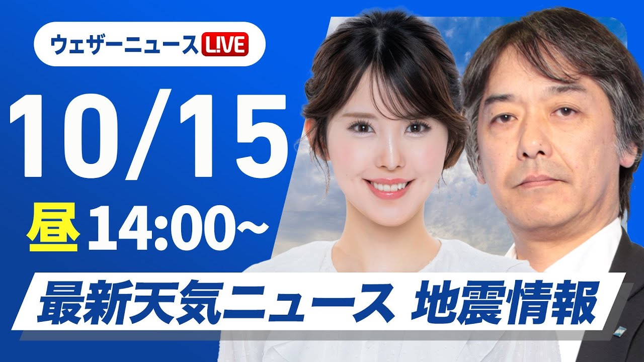 【ライブ】最新天気ニュース・地震情報 2025年10月15日(水)/関東から近畿は曇りや雨〈ウェザーニュースLiVEアフタヌーン・小川千奈/宇野沢達也〉
