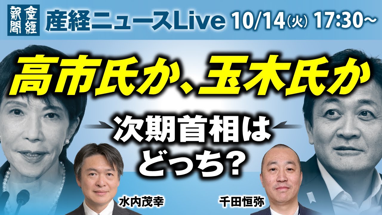 10月14日(火)17時30分~ライブ配信します。「高市氏か、玉木氏か 次期首相はどっち?」をテーマに、産経新聞編集局の水内茂幸編集長と政治部の千田恒弥記者が語ります。