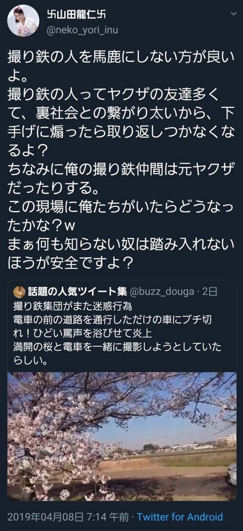 「下がれよ、安月給」「殺すぞ!」撮り鉄が駅員に罵声 近鉄は後日警察に相談「今後は躊躇せず通報」 近鉄・奈良線などが乗り入れる大和西大寺駅(奈良市)のホームで、珍しいタイプの電車を撮ろうと集まった一部の若い鉄道ファンらが 駅員に罵声を浴びせる様子が映った動画がXで投稿され、その行為に批判が出ている。 駅員は危険だと鉄道ファンらに呼びかけたが、「殺すぞ!」などと口答えして騒然となった。 近畿日本鉄道は、こうした発言を確認して後日に警察に相談したと取材に説明し、「今後は躊躇せずに通報します」と明らかにした。 https://news.yahoo.co.jp/articles/f476249f1d5c50946b05452fdfe0824ad68d75ec?page=1 https://www.youtube.com/shorts/0A5kaWiIqLE?feature=share