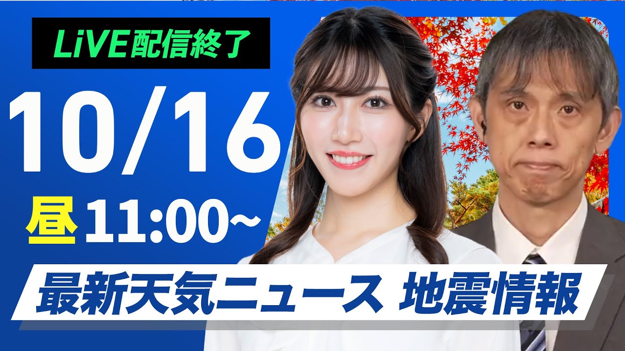 【ライブ配信終了】最新天気ニュース・地震情報 2025年10月16日(木)/東北~九州で広く雨 北陸は大雨のおそれ〈ウェザーニュースLiVEコーヒータイム・魚住茉由/芳野達郎〉