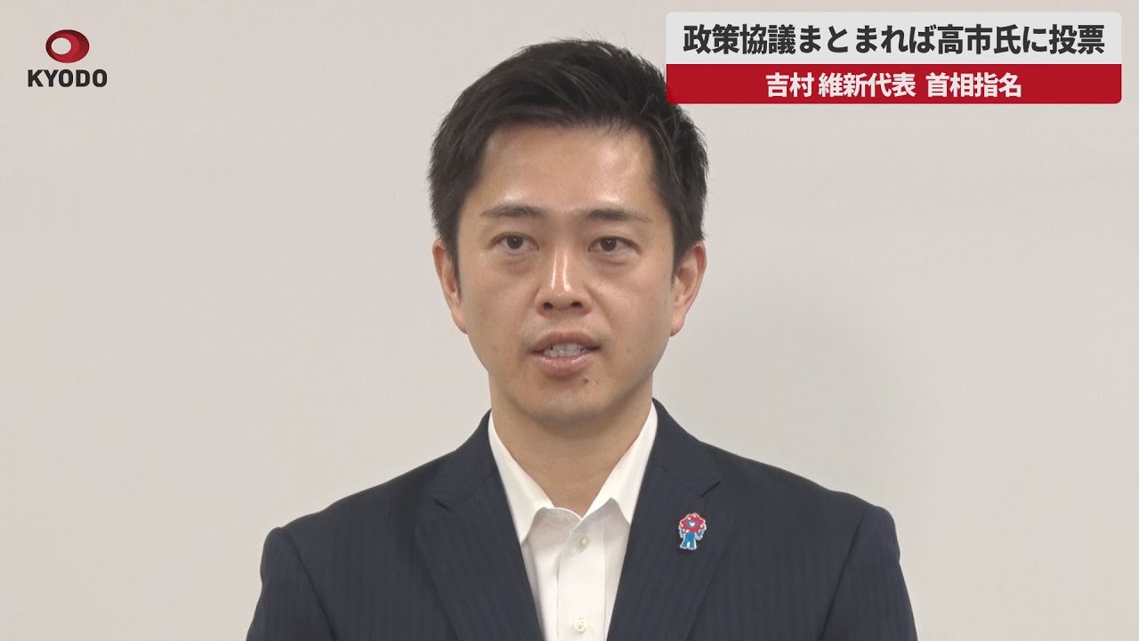 日本維新の会の吉村洋文代表は16日、自民党との政策協議がまとまれば、首相指名選挙で高市早苗総裁に投票することになると思うと述べた。