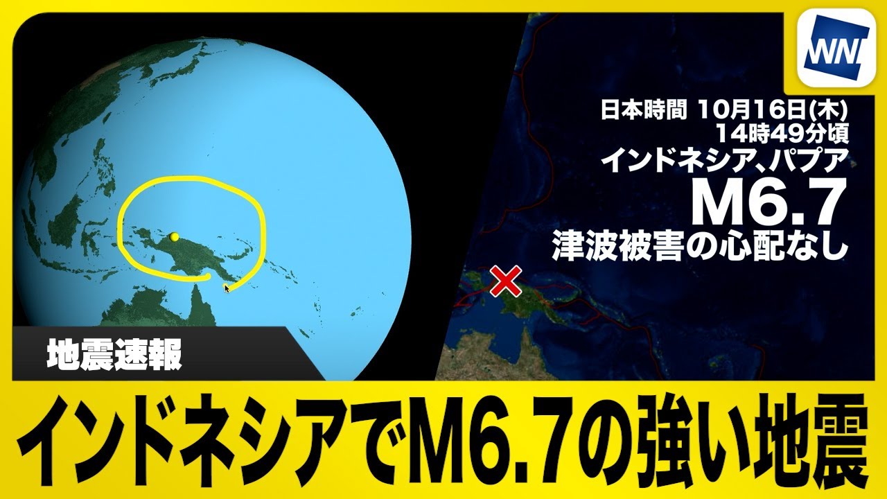 2025年10月16日(木) 14時49分ごろ、インドネシアのパプア(ニューギニア島付近)を震源とするマグニチュード6.7の地震が発生しました。 この地震による日本への津波の心配はありません。