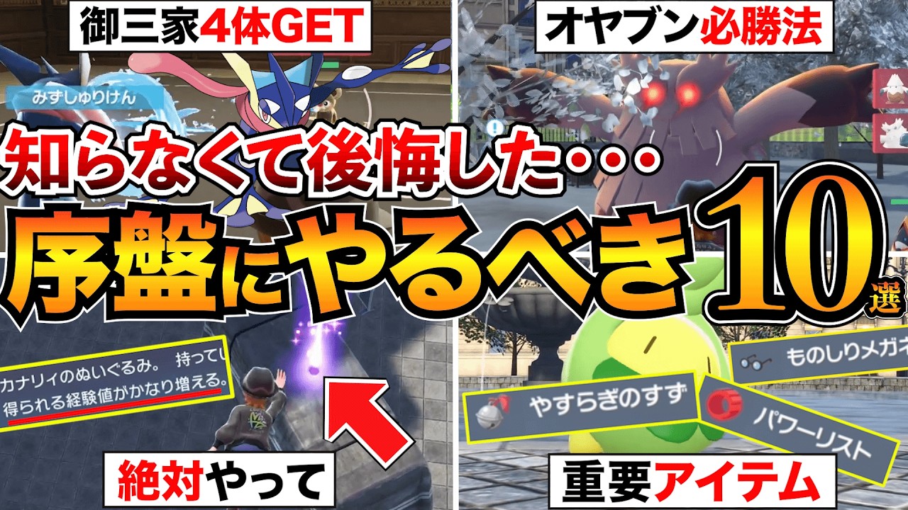 はい、どうもこんにちは。おとです。今回 はポケモンレジェンズデッA序盤にやる べきことをまとめということでゲームを 始めたら最初のうちにやるべきことを紹介 いたします。効率よく進めるための必須 知識になりますので後悔しないように序盤 のうちに見ておくのがおすめです。内容は こちら。概要欄に目次もありますので気に なるところだけでも見ていってください。 で、今回の動画ではストーリーのネタバレ はないんですが、入手できるポケモンだっ たりシステム的なネタバレみたいのはあり ますのでそこはご注意ください。では早速 本編。まず1つ目、取り返しのつかない 要素。こちら最初に把握しておきましょう 。1度選ぶと後で変更できなかったり 取り戻せないものです。まず最初に選ぶ 言語設定。こちら変更できません。あとは 主人公のキャラメイクで性別、肌色、名前 。この3つは後から変更することはでき ません。よく考えて慎重に選びましょう。 それ以外の見た目は変更できます。で、 性別に関しては登場するキャラクターにも 関わります。左側の男性を選ぶとタウニー という女性キャラが出てきまして、右側の 女性キャラを選ぶと外という男性キャラが 出てきます。かなり主要人物になりますの で、性別はこちらも考慮して選びましょう 。あとは5家系ですね。最初にチコリータ 、ポカブ、ワニノコ、この3体を選ぶん ですが、これをね、後から変更すること できません。ま、一応ね、ストーリーの 攻略にも関わってくる要素ではあるんです が、どのポケモン選んでも、ま、 めちゃくちゃ難しくなるとかいうことは ないので、基本的には好きな5家選んで 大丈夫です。で、ここで選ぶ、5家はです ね、性別とか性格、個体値など一応厳選 できる要素はあるんですが、今作ね、 オプションでお任せレポートをオフにする 項目がありません。オートセーブ切れない ので、もし厳選するのであればゲームの 最初からやり直す必要があります。そこは 注意してください。続いては誕生日ですね 。ポケモンセンターで自分の誕生日を設定 できます。これも後から変更はできません 。誕生日にポケモンセンターに行くとこう いう風に祝ってくれます。おそらく、ま、 ゲーム内で特別なメリットがあるわけでは ないんですが、ま、後から変更できないの で慎重に設定しておきましょう。あとは これ毎度のことですが、マスターボール ですね。これはおそらく入手方法限られて いますので、え、どのモンスターに使う かっていうのは慎重に考えましょう。基本 的な取り返しのつかない要素はこんな感じ です。ゲームを始める前にあらかじめ確認 しておいてください。では続いてやるべき こと2つ目は得典の受け取り。ある程度 ゲームを進めて、え、メニューに通信で 遊ぶというのが追加されましたら不思議な 贈り物とか早期購入得典を受け取れます。 こちら選びまして不思議な贈り物を選択。 で、早期購入得典のラルトスに関しては こちらのインターネットで受け取るで もらえます。ダウンロード版の早期購入 得典モンスターボール100個はこちらの Cリアコードで受け取れます。おそらく メールでシリアルコード送られてきてい ますので、え、こちらを入力して受け取り ましょう。その他にも相言葉だったり、え 、受け取れるものありましたら序盤のうち にしっかり受け取っておいてください。 特にモンスターボールに関してはね、今作 めちゃくちゃ使うので非常にありがたい です。ま、その他ね、不思議な贈り物とか 何かね、公式から配布されるものありまし たらこちらのチャンネルで発信していこう と思いますので、是非チャンネル登録 よろしくお願いします。続いてやるべき ことは技のセット。ま、これちょっと些細 な話ではあるんですが、ま、今作はね、 この技覚えた技を、ま、自由に思い出して 入れ替えることができます。技マシンもね 、あの、回数制限とかないので、ま、 いくらでもこう覚えさせられると。で、 結構ね、レベルアップした後にポケモンで 、新しい技覚えるんですけども、ま、特に ね、新しい技覚えますか?みたいな、そう いうポップアップもないので、結構ね、 序盤忘れがちだと思います。ま、気づい たら結構レベルが上がってて、新しい技 覚えてたみたいなこともありますので、ま 、是非ね、定期的に、え、このね、技を チェックしておいて、新しい技覚えてない かなっていうのは確認しておきましょう。 これね、序盤忘れてると、ま、結構ね、技 が弱くて進めるの大変になっちゃうので 注意してください。続いて、5系 ミッション4種。ここはね、あの、入手 できるポケモンのかなりネタバレになり ますので、そういうの見たくないっていう 方はスキップしてください。はい、ではき ます。今作ね、序盤に発生する サブミッションによってカロス5家3体と 担東5件のうちの1体が入手できます。 非常に強力なので是非序盤のうちにやって おきま
