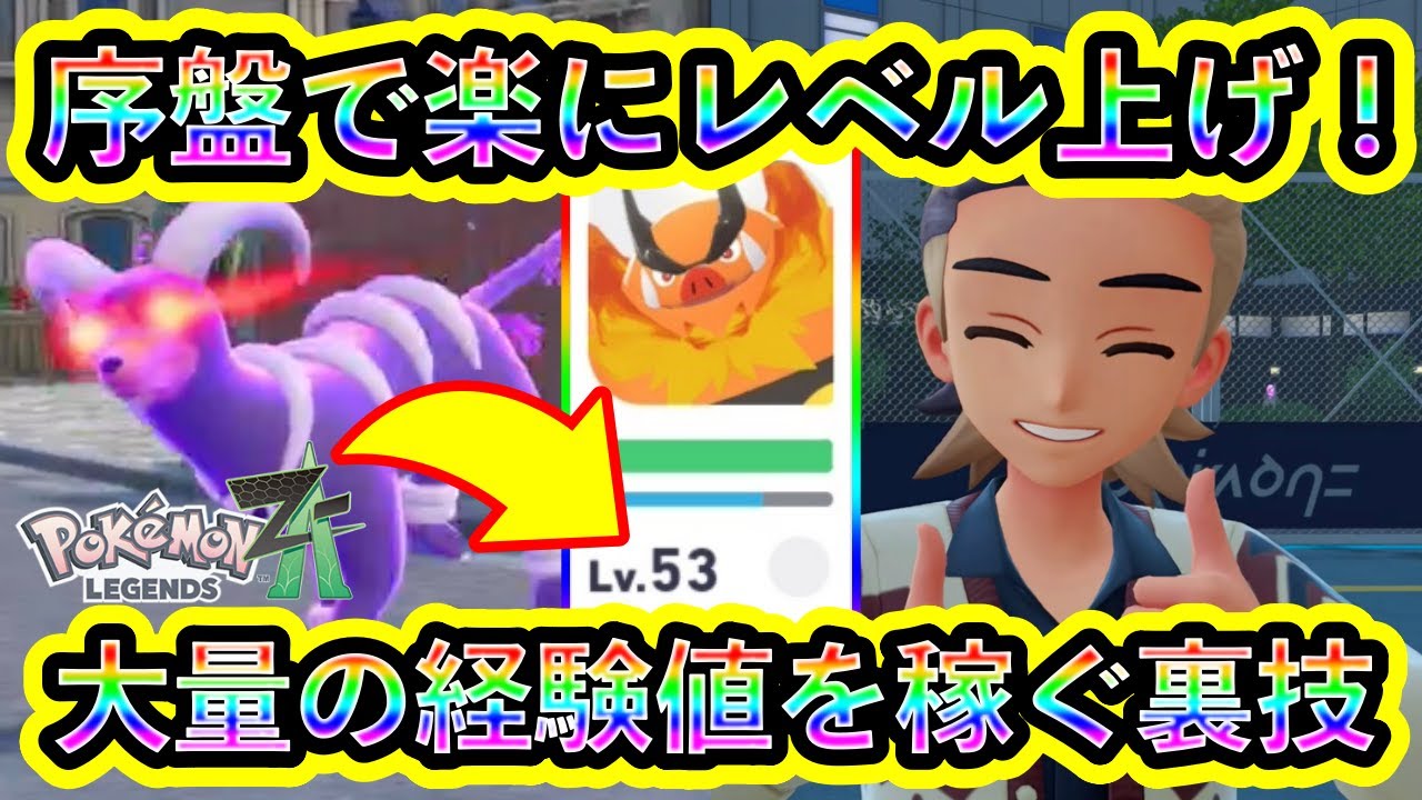 はい、どう皆さんこちクです。今回もですね、ポケモンレジェンend ZA の情報をお届けしていきたいと思います。 さあ、で、今回はですね、ストーリーの序盤で楽々楽々楽々楽にポケモンのレベルをアップしていく攻略法と皆さんに紹介していきたいと思います。え、現在僕のデータはですね、こちらロバイアルランクが Wですね。なのでZから始まってYxw と、ま、3段階ぐらいしかまだランクが 上がってないというね、超序盤の方なん ですけども、ま、こちらね、見ていただい たら分かるようにこの塩部をレベル53 まで上がってるというね、ま、だいぶ こんな感じで素早くポケモンレベルを 上げれるという方法が見つかったので、 今回ね、皆さんにそちらを紹介していき たいと思います。で、今回紹介するレベル 上げをするメリットとしては、ま、 もちろんね、ストーリー序盤で効率的に楽 にレベル上げができますので、サクサク ストーリー攻略が進むというのももちろん なんですけども、それ以外にもね、親分 ポケモンをたくさん捕まえることができる というメリットもあります。で、親分ポケ モンっていうのはね、ま、過去作の ポケモンレジェンズアルセウスの方でも、 ま、採用されてたポケモンの種類なんです けども、こんな感じでバカでかいポケモン がいるんですよね。ま、こういう親分 ポケモンいっぱい捕まえれるよっていう やつですね。ま、これも全部親分ポケモン になってます。ま、こういうバカでかい ポケモンたちをストーリーの、ま、序盤の 方でね、ま、しっかりと仲間にしていける といった感じになってますので、ま、そう いったメリットもありますと。で、さらに 若干のお金稼ぎにもつがるかなという風に 思いますので、是非今回のレベル上げ方法 が知りたいという方は動画を最後までご覧 ください。 いうわけで早速ね、え、レベル上げ方法を 紹介していきたいと思います。さあ、て ことで今回のレベル上げ方法は、ま、 ストーリー序盤からできると言いつつも、 ま、ある程度ストーリー進めていかないと できないということで、具体的にどの時点 でできるようになるかと言いますと、この ワイルドゾーンがありますよね。この野生 ポケモンと出会えるワイルドゾーンで、 これの6番ですね。ここワイルドゾーン6 番が解放されたら、ま、すぐにできると いったような、ま、方法になります。で、 これもね、結構序盤の方で解放されてる はずなんですよね。確かロイヤルランクX に到達した時点でもう解放されてたはずな んで、ま、結構ね、進めていったらすぐに ワイルドゾーン6番解放されてると思い ます。ある程度ストーリーを進めていって ワイルドゾーン6番を解放したらその後 ですね一旦このワイルドゾーン5番に行っ てください。はい。これね、ワイルド ゾーン5番。まずはこの5番のワイルド ゾーンに入ってもらってで、ここである ポケモンを捕まえてもらいますと。で、 それがですね、この入ってすぐ左手を登っ たところにこんな感じでこの草がね、 追いしげってるとこがあるんですけども、 ここにね、フレというポケモンが湧くんで 、この子をね、捕まえてもらいます。ほい と。 で、これでもし捕まらなかった場合は、ま 、適当にポケモンバトルで気絶させて、で 、そこにボールを投げて捕まえますと。 はい、オッケー。で、このથી出をね、今 から有効活用していきます。はい。この子 がですね、さっき捕まえたレベル14の 節出になるんですけども、まずはこの 使える技を選ぶですね、これを選択して、 で、ここに毒張りというね、技が隠されて ますんで、これを、ま、どの技とでもいい ので入れ替えましょう。はい。こんな感じ で。で、この毒張りを覚えた節出を準備 できたら、あとはこのね、え、6番の ワイルドゾーン、こちらに向かいます。 はい。これね、え、ワイルドゾーン6番。 ここに入りましょう。で、ここはね、親分 のポケモンがめっちゃくちゃ多いんですよ 。ま、最低でも固定シンボルでね、3体 湧いてるってことで、ま、とりあえずね、 このさっきゲットした節でをスタンバイさ せておいて、で、入ってきた。すぐここね 、降りてきたらここに亀テの親分がいるん で、この子にね、ま、毒張りを振ってあげ ましょう。で、これ毒状態にね、なら なかったんで、その場合はすぐにはしご 登って逃げます。速やかに逃げてで、今 あの画面の上の方にね、あの目のマークが 見えてると思うんですけど、これ敵に 見つかってる状態なんで、これを一旦解除 しないといけないんでね、こんな感じで このワイルドゾーンのゲートを出ます。1 回ね。で、また入ると。で、そしたら こんな感じで、ま、負けますんで。お、 なんかまだ 大丈夫かな? まだ見つかってんな。ま、たまにね、 こんな感じで結構時間開けないとずっと しつこくね、追いかけてくるやつもいるん で、 ま、ある程度時間を開けてまた入ってきて 、ま、親分以外のモブのポケモ