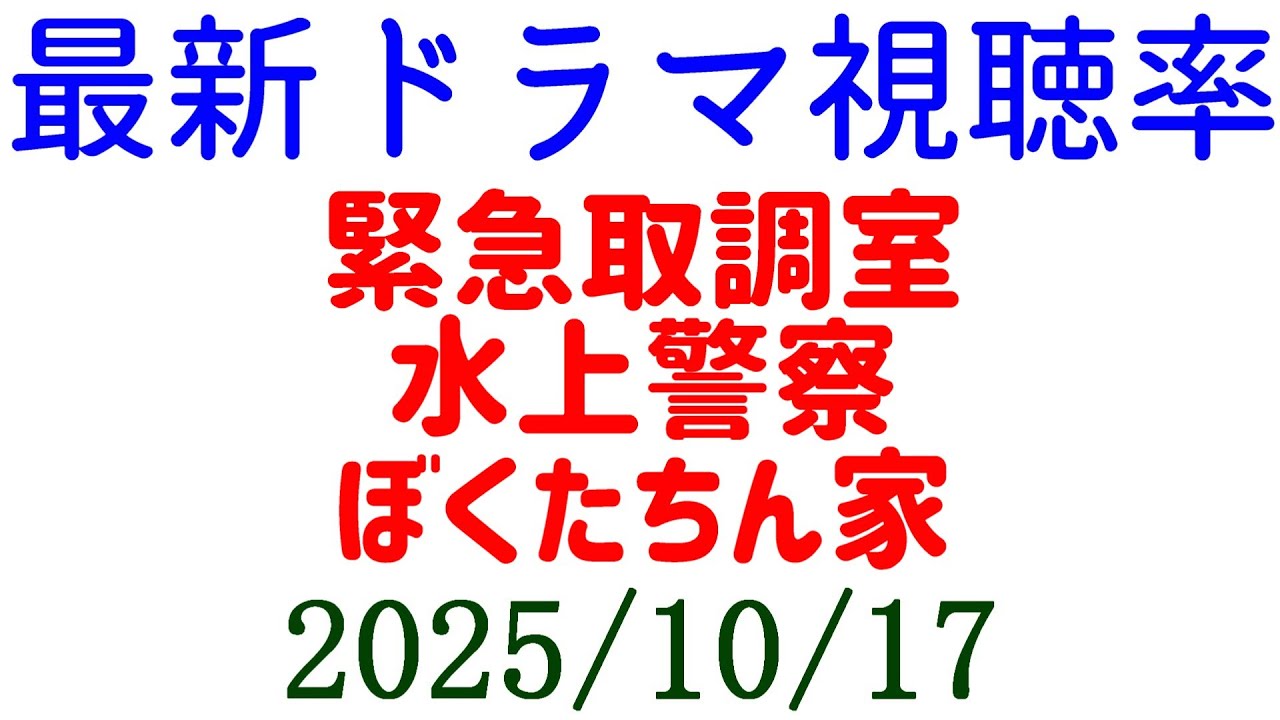 視聴率報です。火曜日の新東京水場警察の 第1話の視聴率が6%でしたね。はい。 6%。 そして木曜日の視聴率、緊急取り調べ質の 第1話視聴率が10.8%でした。視張率 高いですね。そして僕たちの第1話日曜 ドラマ視聴率が第1話は5.1%という ことで新水警察緊急取調べ僕たちの視聴率 が出ましたね。で、え、緊急取調べ質 10%超えましたね。10.8%。 ザロイヤルファミリーの次に2番目に視聴 率いいですね。1話目ね。で、3番目が 相棒が10.4ですね。10%超えてるの が今期は3つですね。はい。ただ、ま、 あの、10%台視聴率維持できるかどうか ですけどね。はい。で、え、本日高知と フェイクマミー金曜日放送ですね。で、 来週の火曜日ちょっとだけエスパーが放送 開始で、そしたら10月期のドラマの放送 が、ま、出揃いますよね。はい。という ことで、はい。今期ね、え、10%超える ドラマが 3つですね。はい。平均10%超えるか まだ分かんないですけどね。うん。初回 だけ10%であとは10%届かないって いうそもあるしうん。ずっと10%維持 する場合もあるかもしれないですけどね。 はい。ということでね、え、視聴率ね、 あと、えっとね、小さい頃は神様がいてと バケバケはまだ視聴率出てないので、もし 出たら更新します。速報でした。