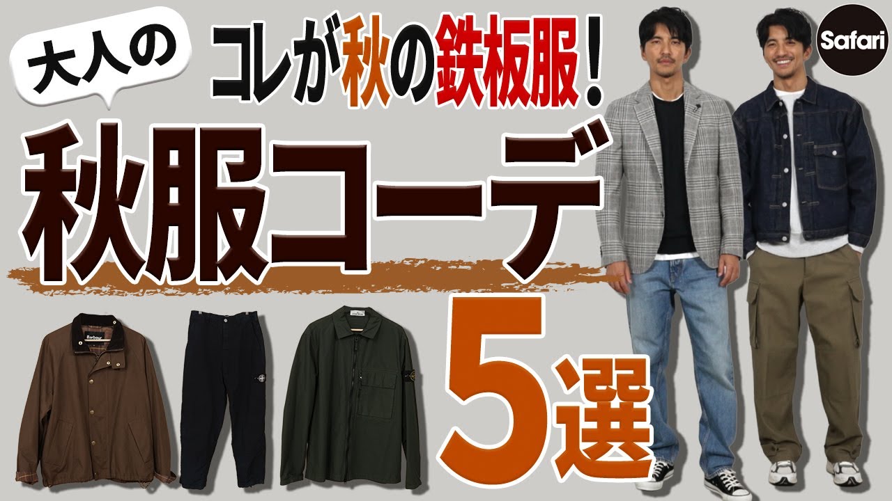 ここで外してしまうともうおしゃれに 見せるのが難しくなってしまうのでこの セレクトはとにかく重要。新鮮さがあり つつも大人にふさわしい今時なおしゃれが できるというわけなんですね。はい、 こんにちは。サファリチャンネルのこ太 です。なんだかんだね、まだまだ暑いん ですけど、カレンダーの上ではすっかり秋 ということで、今回は少しね、トレンド感 も意識した今年らしいおすすめの空コデを 紹介したいと思います。では早速行ってみ ましょう。 [音楽] というわけで今回は最新版の秋の コーディネートをご紹介していくわけです が、ここでね、やっぱり重要になってくる のが着こなしのジックとなるキーアイテム ですよね。ま、そもそもね、ここで外して しまうともうおしゃれに見せるのが難しく なってしまうので、このセレクトは とにかく重要。じゃあそのキーアイテムに はどんなものを選べばいいかと言うと、 ズバりさりげなくトレンドを意識しつつ、 今っぽくアップデートされた定番アイテム こそがベスト。もうね、少し噛み砕いて 説明すると、まずは大人のファッションな ので定番的なアイテムであるということ。 これならどんな着こなしも違和感なく 取り入れやすいですよね。そしてそこに 例えばシルエットであったりカラーであっ たりトレンド感のある今っぽいニュアンス がプラスされているということも大事です 。これで新鮮さがありつつも大人に ふさわしい今時きなおしゃれができると いうわけなんですね。ということで今回 まずはそんな鍵となるアイテムを5つ ピックアップしました。それがこちら バブアーのカバーオールジャケット。 フルカウントのデニムジャケット、 ストーンアイランドのテックパンツ、 ストーンアイランドのシャツジャケット、 ラルディーニのチェックジャケット。定番 アイテムばかりだし、今までとあまり 変わり映えもしないじゃんと思った人も いるかもしれませんが、実はこれらの アイテム今までとは違うポイントが結構 あるんです。ということでこの後まずは これらの5つのキーアイテムの特徴や 今シーズンならではの選びのポイントなど を詳しく解説していこうと思います。後半 ではね、この5つのアイテムを軸にしたお すすめコーディネートも紹介していきたい と思いますので、是非最後まで見て いただければと思います。あとチャンネル 登録いいねもよろしくお願いしますね。 [音楽] はい。じゃあ、秋のキーアイテム1着目を 紹介したいんですが、まずはね、バブアー のカバーオールですね。バブアーと言うと ビデイルとかこうビューフォートとかね、 星丈竹の竹のジャケットが定番人気なん ですが、これはね、ちょっと短めの竹の トランスポートというモデルです。で、 これ今シーズンは短めのきが注目という わけではなく、実はポイントがこのカラー なんですよね。先日配信した色合わせの 動画でもね、紹介したばかりなんですが、 この空振はブラウンがトレンドカラー。 これがね、40代、50代の大人の皆さん にもお勧めということをお伝えしたんです が、今回はそんな流れもあって、是非 ブラウンのアイテムを押していきたいなと 。ということで、定番アイテムでもこの ブラウンを取り入れてトレンド感になる おしゃれな気粉なしを狙いたいというわけ なんです。ブラウンは落ち着きがあって 大人っぽい雰囲気の反面ともすると やぼったくなりがちなカラー。でもね、 このバボアのトランスポートは短めのきで すっきりとしたデザイン。警戒感のある 大人のカジュアルにね、売っ付けの1着な ので、これならね、うまくトレンドカラー のブラウンの良さを引き出してくれると 思います。では続きまして、秋のキー アイテムの2着目なんですが、こちらです ね。フルカウントのデニムジャケット。ま 、いわゆるジンですね。ジンは定番中の 定番なんで、さすがにね、ちょっと今更感 を感じる人もいるかもしれませんが、実は このジンが今シーズン見逃せないアイテム なんです。ここ最近デニム自体の人気が 上がっているのはご存知の通りなんですが 、今期は特にデニム素材のアウター類の 注目が爆上がり中。今回ここで紹介するの は色落ちしていないインディゴブルーのね 、バッグに非常が付いたヴンテージ スタイルの一着で、いわゆるファースト タイプのじなんですが、これだけでなく カバーウォールタイプやフロントジップの トラッカータイプ、ミリタリ調のシャツ アウターなどが様々なブランドから登場し ていたりと、ま、今シーズンはね、 バリエーションもとにかく豊富。まずは このオーセンティックなノコのね、デニム ジャケットを基本に揃えてさらに気になる アイテムをチェックするなんてのもいいか もしれません。はい。じゃあ次はパンツな んですが、今やすっかり定番になったと 言っても過言でもないテック系のパンツ ですね。で、このテックパンツなんです けど、これまでのは割