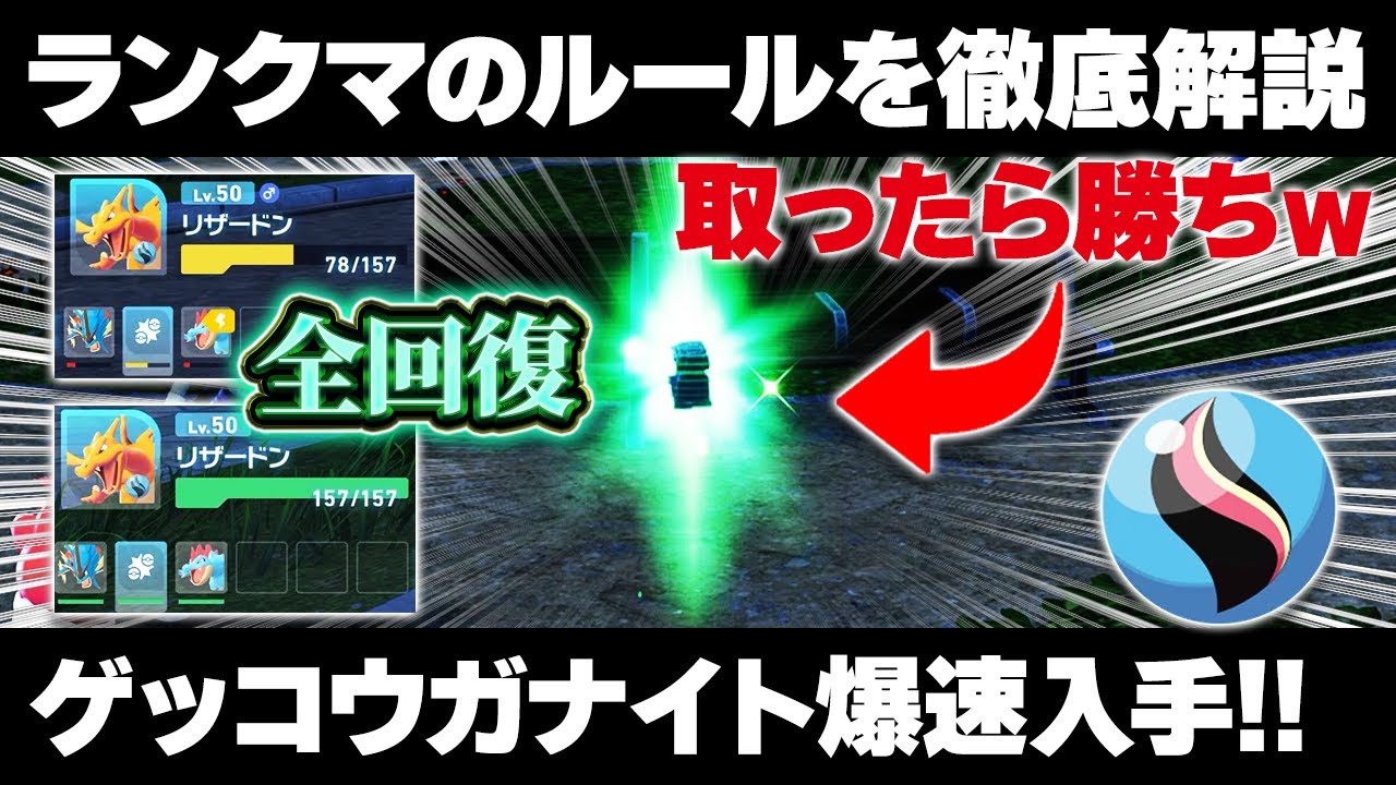 はい、どうもそにです。今回はですね、 ポケモンZランクマが今日の3時から実装 されましたということです。ま、もうね、 早速プレイしてですね、ランクマの報酬に 月光がないとが追加されてたので、そちら を回収してきました。はい。ま、ちょっと ね、ルールとかの説明とかを色々しながら ですね、ま、気づいたことだったりを皆 さんに共有できたらなと思います。はい。 ま、とりあえず概要がこんな感じですね。 ま、シーズン1が開催されます。ま、 ランクバトル選択して遊んでください。で 、期間が11月5日まで一旦やりますよと いうことですね。で、レギュレーションが 見荒れ図鑑のポケモンでレベルは100 レベでも1レベでも結局50レベになるの で、ま、とりあえず皆さんいきなり挑戦 するということが可能です。はい。で、 道具を持たせることができて、ま、参加さ せるポケモンのうち2匹以上のポケモンに 同じ道具を持たせることはできませんよと 。ま、だから食べ残しを2つ持たせるとか ね、お盆のみを2個持たせるとかはでき ないよといった感じです。ま、基本的にね 、メガストーンを持たせてることが多いん で、ま、そんなに被ぶったりはしないかな 。で、対戦時間3分で、ま、時間に関して はちょうどいいぐらいの感覚でした。なん か報酬が3種類ありますね。ま、シーズン 報酬は最後のランクマが終了時にもらえる 報酬でランク上がった時の報酬ですね。ま 、これに月がナイトとかが含まれてて、 今回Kランクまで上げれば一旦月行がない ともらえますね。はい。で、あとはメガ かけラとかね、色々もらえるものがあり ました。で、対戦報酬ですね。ま、この辺 はなんだろう。経験とかかな。ま、 とりあえずなんか色々もらえました。で、 シーズン報酬がこんな感じ。Aランクまで 上げるとコンペボールから始まり、金の 王冠、銀の王冠、海善の種でかい金の玉と はい。ま、豪華になっていきますね。 ランク上げれば上げるほどとりあえず、ま 、毎Aランクまでは上げたいよねみたいな 感じの内容ですね。で、一応ね、配布され ているその月光がないと、ま、報酬となる メガストーンについては再配布も予定され てるとのことなので、ま、最悪ね、あと あのZを買ってやばい月光がないとか手に 入らないみたいなことはないですよという ことですね。はい。で、一応ね、ランクが 下がったりすることもありませんとのこと で、かなり優しい仕様にはなってます。 はい。で、ランクバトルはですね、4人で 殴り合うリアルタイムバトルです。はい。 ま、これはちょっとね、PVとかでもあっ たかもしれないんですが、ま、こちらが ルール説明となってて、ま、ちょっと映像 も後から見せるんですけど、ま、4人で とりあえず、ま、あの、自分の手持ち3体 決めてですね。これね、ちょっとこの仕様 が結構だるくて手持ちから登録できません でした。使うポケモンは一旦ね、ボックス に移動させないといけないというところが あったので、そこだけちょっとね、あ、ま 、めんどくさかったけど、手持ちから移し てボックスからチームを登録すると。はい 。で、道具を持たせて、ま、ランクバトル 参加しますよと。で、ま、敵を倒した回数 が多ければ多いほど1位から4位が決まる みたいな感じの内容でしたね。で、それ 以外にですね、一応フィールドにこの ランクマ専用の特殊なアイテムみたいなの が落ちてます。この緑色のやつ、ま、ある と思うんだけど、これがね、緑と赤と青と あって、緑だとHP回復で、青が防御特防 がアップで、赤が攻撃特攻が上がるよ みたいな。これはもう積極的に拾った方が いいです。で、メガエネルギーの塊みたい なのはもうあれですね、あのストーリー モードでもあるあれが落ちてるんで、ま、 ここにある、この右のね、緑色の ファーカーの人の後ろにあるこのかけら 拾うと、ま、メガ進化しやすくなるよ みたいな内容ですね。で、この緑の道具強 すぎ。取った瞬間全回復するんでこ ぶっ壊れもこれ拾ったら勝つ。それぐらい 強いですね。はい、ということでね、ま、 とりあえず僕は使ってたポケモンを3匹 適当に選んだ感じですね。ギャラドス オーダイルリザードンとかいう電気タイプ どうすんの?みたいな構築です。はい。で 、今ね、僕がギャラドスで殴ろうとした 瞬間相手メガニウムに変えてきましたね。 こういうプレイイングが出てきます。ま、 弱点ポケモンが出されたらだから倒され ちゃうんで交代するって感じですね。で、 今倒せそうなタイミングで変えられたね、 メガニウム。あれ実はギリギリ耐えてまし た。はい。で、今交代僕ももう2回使っ ちゃったんでちょっと挟まれてかなり やばい状況ではありますね。はい。ここは またリザードンに変えて、ま、こんな感じ でね、4体全部に対応することできない から、やっぱり弱点が少ないポケモンを 用意するのは強いかなとは思いましたね。 ま、あとはもう光の壁とかリフレクターと か