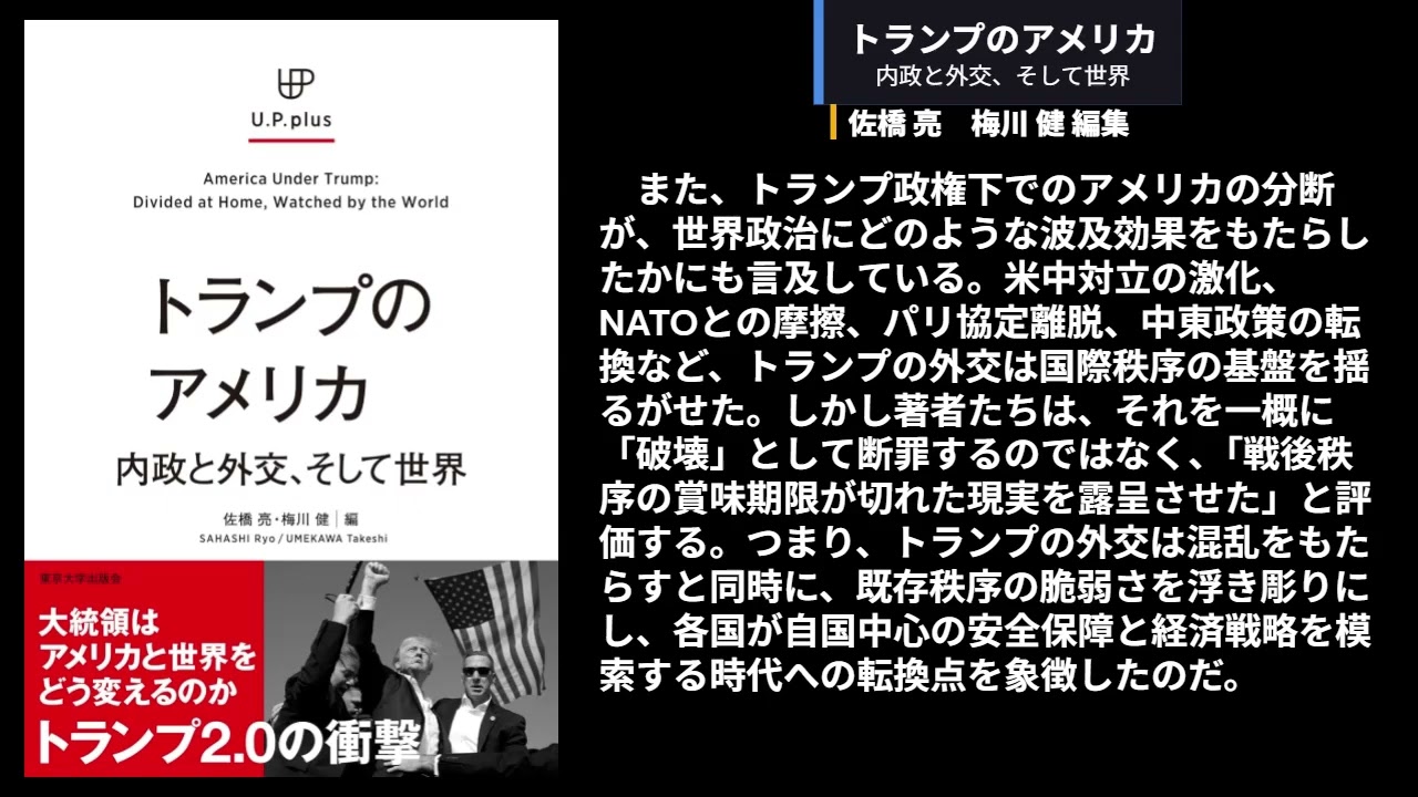 [音楽] トランプのアメリカ内政と外交そして 世界アップ プラス本書はドナルドトランプという現象 を単なる政治的スキャンダルや ポピュリズムの象徴としてではなく アメリカ社会の真層構造の変化として 捉え直す学術的な試みである。多くの評論 や報道がトランプ個人の言動や キャラクターに焦点を当てる中で本書は なぜトランプが誕生したのか。彼の登場が アメリカと世界に何をもたらしたのかを 冷静かつ体型的に分析している。その意味 で本書はトランプ研究の1つの到達点とも 言える。まず注目すべきはトランプ政権の 内政的基盤を社会経済的変動の文脈から 描き出している点である。 本書の必者たちはグロバル化によって 置き去りにされた白人労働者層いわゆる ラストベルトの不満がどのようにして トランプ指示へと転加したのかを詳細に 分析する。製造業の空洞化移民の像所得差 の拡大といった構造的問題がアメリカ社会 の中間層の崩壊とアイデンティティの危機 を生み出したという指摘は説得力がある。 トランプが掲げたアメリカファーストは 単なるスローガンではなく、こうした経済 的不満をナショナリズムの形で同員する 政治的戦略だったという分析は本書の中心 的洞察である。次に外交政策の分析も 極めて興味深い。従来のアメリカ外交が 冷戦後の自由主義的国際秩場を基盤として きたのに対し、トランプ政権はそれを大胆 に否定し、同盟関係や他国主義を取引の 対象と見なした。著者たちはこれを単なる 孤立主義への会機とは見なさず、アメリカ の派遣の最低として理解する。トランプは 同盟国に対してコスト負担を迫り、国際 機関を批判し、中国との貿易戦争を仕掛け た。その背後にあるのはグロバル化の恩恵 がもはやアメリカ国民全体に及ばないと いう現実認識であり、国際秩序の維持より も国内産業と雇用の保護を優先する新しい リアリズムであった。本書はこの点を経済 ナショナリズムを軸とした新たなアメリカ 外交として位置づける。この資は感情的な トランプ批判に陥らず、現実主義的観点 から彼の政策を評価する冷静さを持つ。 さらに本書はトランプ現象をアメリカの 政治文化の変用としても捉える。SNS 時代における政治のパフォーマンスか メディア環境の分断、そして事実より感情 が優先される政治空間の形成といった要素 がトランプ指示の土上を育くんだとする 分析は鋭い。フェイクニュースや陰謀論が 拡散しやすい環境は民主主義の基盤を侵食 し、従来のエリート主導の政治構造を画解 させた。トランプはその混乱の産物である と同時に演出者としてその構造を匠みに 利用した存在でもある。本書はその点で トランプを原因ではなく症状として捉える 資格を提供している。またトランプ政権化 でのアメリカの分団が世界政治にどのよう な波及効果をもたらしたかにも言及して いる。米中対立の激との摩擦パリ協艇離脱 中東政策の転換などトランプの外交は国際 秩序の基盤を揺がせた。しかし著者たちは それを一概に破壊として断罪するのでは なく戦後秩序の賞味期限が切れた現実を 露呈させたと評価する。つまりトランプの 外交は混乱をもたらすと同時に既存秩序の 脆弱差を浮き彫りにし、各国が時国中心の 安全保障と経済戦略を模索する時代への 転換点を象徴したのだ。トランプ後の バイデン政権が他国間主義への怪奇を図っ ても世界はもはやポストトランプ時代の 構造的変化から逃れられないことを示唆し ている。本書の強みはイデオロギーに偏ら ない分析姿勢である。ファントランプでも トランプ用語でもなくアメリカという国家 の変出を俯瞰的に捉える姿勢が一貫して いる。そのため読者はトランプ現象を異常 ではなく必然として理解することができる 。トランプは民主主義の例外ではなく グローバルか時代における新しい大衆政治 の形態を対現した存在でありその意味では 21世紀の政治徴流を先取りしていたとも 言える。掃じてトランプのアメリカは アメリカ政治を単なる国内問題としてでは なく、国際秩序全体の変動の文脈で理解 するための優れた手引きである。トランプ を終わった現象と切り捨てるのではなく、 現代民主主義が抱える構造的危機の競像と して捉えるべきだという本書のメッセージ は重い。ポピュリズム、グローバル化の 限界、民主主義の変出、これらのキー ワードに関心を持つ読者にとって本書は 不可欠の1冊である。冷静な必死と厚みの ある分析がトランプを超えてアメリカその ものの最低を促す点にこそ本書の進化が ある。