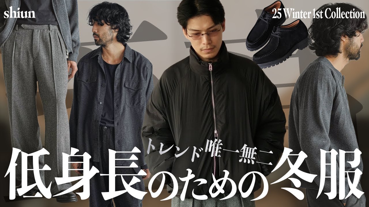 どうもワムーです。今回はですね、シン 25ファーストウィンターコレクション ですね、ラインナップ動画を撮っていこう と思います。ありがとうございます。前回 ですね、オータムセカンドコレクション ですか、たくさんのね、ご来場をいただき まして深く感謝申し上げます。特にですね 、川靴に関して再販もね、いたしまして、 合計で947 個ですね、販売できました。1000人 近くの身長がね、6cmアップしたんすよ 。すごいどっかの村の平均身長アップして んじゃうってぐらいたくさんの方にね、 購入いただきまして本当にね、深く感謝 申し上げます。でね、今回ついにすね、冬 がもうやってきますね。低身長にとって冬 ってどういう印象ですか?僕ね、結構冬 って低身長でもカっこよく見せる スタイリングって難しいなっていう印象 あるんすよね。それもそのはず世に出回っ ている服ね。ま、もちろん全部かっこいい んですが、全部さ、大きいやん。なんで 自然と重ねぎが増える冬ってまずインナー ね、論テキュリアンま、大きいやんか。で 、その上からニットかなんかキュリアやん 。大きいやん。で、上に10ター キュリアンこうとかダウンね。キュリアン かきやん。どんどんブクブクしていくん ですよねえ。ブクブクしていくと体の シルエットが消えて太く見え、低身身長が さらにスタイルが悪く見えて低身身長が さらに低身身長に見えるんですよね。冬 って難しいんすよ。でね、パンツに関して もですね、生地が熱くなっていきますよね 。で、生地が熱くなっていき、そもそも ベースしてサイズが合っていないなので、 より単速に見るとね、めっちゃ怖いやん冬 って。冬僕好きっすよ。空気も住んでるし 、星も綺麗やしね。女性のマフラーも 可愛いし。冬好きですが、服に関しては 低身長に対して厳しすぎへんかっていうね 、ことも思うんですよ。で、じゃあシ運は どうすると日本人中の低身長を獲得するね 、どっかの村の平均身長を6cmアップし た芯はですね、どうすんねということで、 停止身長にしかね、似合わない冬服をね、 今回もたくさん用意しております。そのね 、ファーストコレクションとして低身長の 冬パテットジャケット問題を解決する ジャケットも用意しておりますし、冬低身 長でも簡単にこな感、おしゃれ感を演出 できて足もき麗に長く見えるスラックスも 用意しております。他にもね、シャツや ニット用意していますので、是非ですね、 この動画楽しんでいただけると幸いです。 では本編どうぞ。 [音楽] 冬の本命すね。もうこれは今年のチーンの 僕的にね、1番好きなね、アイテムを紹介 していこうと思います。こちらナイロン ショートパテットブルゾンですね。 パテットブルゾンですね、昨年もね、販売 しておりまして、無事ね、完売いたしまし た。そんなね、アイテムでございます。 今回はですね、より綺麗めな炎症にしよう と思ってですね、うステのね、ナイロンを 採用しました。このね、独特な光沢感非常 に気に入っております。かなりナイロンの それが薄いので、このね自然な落ち感って いうのもめちゃくちゃいいんすよね。僕が 日々発信してるんですけども、低身長面 ແມ່ນ面ですね。特に僕みたいな低身長 面にね、必要なものって、ま、いっぱい あるんですが、こういうね、落ち感って いうのを大事にしておりまして、落ち感が あることによって体に馴染んでくれるんす よ。落ち管の大業っていうのは針感って いうのがあるんねけどさ、もう張りカって 言葉聞くだけで怖ない。貼ってると僕たち のちっちゃい体以上に生地がドンって出る んですよね。で、生地がドンって出ちゃう と四角形に近づいて切られている感が強く なり、スタイルが悪くなり、子供っぽく 見え、かっこよく見えない。A身長に 見えるそういう地獄のスパイラルが回っ てるんですよ。もちろんカリカのある記事 でもジャストサイズで切れればかっこいい ですよ。ただカリカのある記事で低身身長 でもジャストで切れる服ってどこにありま のって話でございましてなのでお近のある 服っていうのをね普段からお勧めしてるん ですがこれは低身長にも合うようなサイズ 感で作っておりかつお時間があるナイロン を使ってるんで低身長にベストマッチング なアイテムでございます。さらにですね、 ワッシャー加工を施しましてヴンテージ感 を演出しております。いいですね。ワッ シャー単語が一番好きやわ。でね、こう いう薄手のナイロンって襟り回り寒いこと 多いんですが、やっぱ襟り回りさえね、 あっためておればここに太い血管が集中し ているんで、正直あったかいってことです ね。しっかりと本性のあるボア素材を使用 しております。なんでね、めちゃくちゃ あったかい、柔らかいお母さんの手で あっためてくれてるようなそんな感じで ございます。今のターったでデザインに 関してはシ運らしくミニさを追求しました 。このねステッチレスにすることに