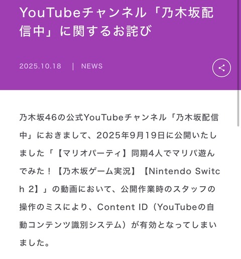 【ニュース更新】 YouTubeチャンネル「乃木坂配信中」に関するお詫び https://t.co/dBycqXjqjQ pic.twitter.com/LTuQRDYF92— 乃木坂46 (@nogizaka46) October 18, 2025