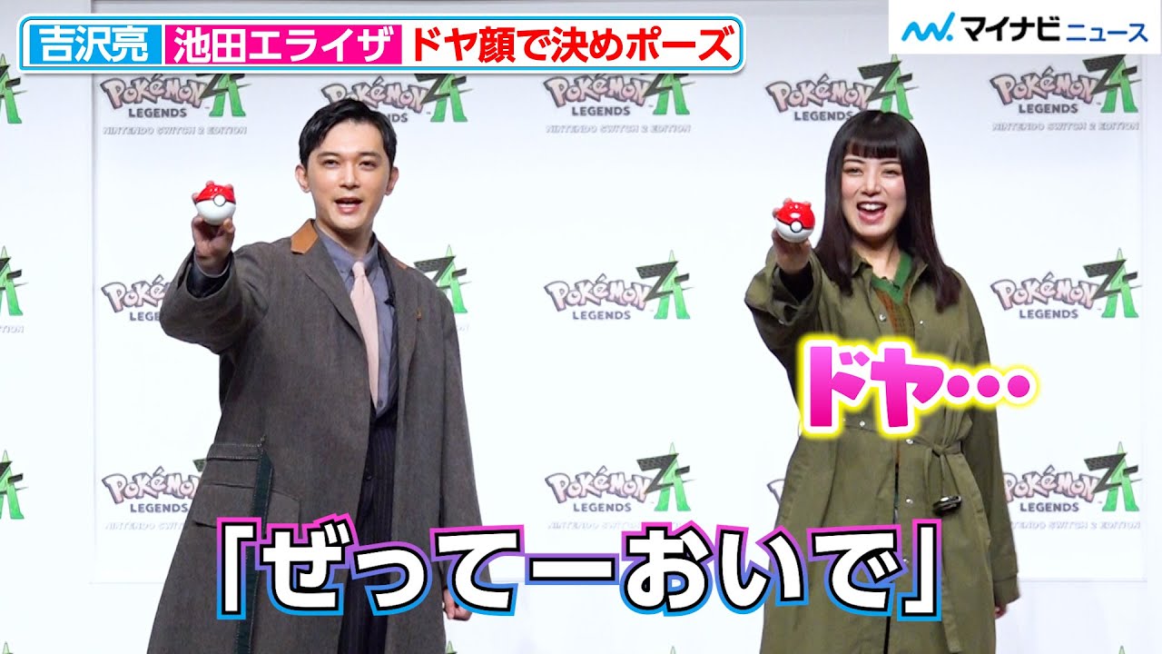 一緒にですね、フォトタイムとさせていただきます。 ておいで。 でや、 本日のゲストにご登場いただきます俳優の吉沢り涼さん、池田偉い座さんです。どうぞ。礼します。 [拍手] お願いします。 どれか。 こんにちは。よろしくお願いいたします。 はい、もう1 歩前その辺りでお願いいたします。一言ずつお願いいたします。吉田さんから。 はい。あ、これか。 はい。え、本日はお集まりいただきありがとうございます。え、そうですね。え、ついに明日 はい。 発売ということで、ま、僕自身も非常に楽しみにしておりますが、ま、いろんなお話ができればなと思っております。よろしくお願いします。 はい、ありがとうございます。よろしくお願いします。池田さんも一言お願いします。 はい。 え、私もあの発表当初からとても楽しみにしていたこの作品のあ、イベントにまさか自分が出ているっていうのはとても考え深いですが、今日は楽しい時間にしていけたらなと思います。よろしくお願いいたします。 よろしくお願いいたします。さあ、本日は実際にポケモンレジェンend Zの新CM のご以上でお越しいただきましたね。 改めてCM をご覧になってみていかがでしたか?吉沢さん感想をお願いします。 そうですね、ま、その実際の撮影の現場もこのミアレシティのようなおしれなこの街並の舞台にあの撮ってたんですけど、もう非常にこうなんだろうな、そうしれな街にポケモンと共に共存してるっていうなんかすごくっこいい CM になったなっていう感じがしてはい。非常に嬉しく思いますね。 はい、ありがとうございます。池田さんはいかがでしょうか? 私のCM はあの夜から始まるんですけど、ちょっとこう夜のミステリアスでちょっとなんだろう戦いのムードも戦ってきているような中から 昼にパッと変わると一緒にワニの子お茶をしているような名やかなシーンを取ったりとかして [音楽] なんかそれもすごくこのゲームを象徴しているなと思いました。 はい、ありがとうございます。お 2人が出演されたポケモンレジェンズ Z ついに明日からですね、発売開始となります。是非お 2 人から一言ずつ今のお気持ちをいただけますでしょうか?吉田さんいかがでしょう? いや、もう楽しみですね。 もう僕のあの周りの友達ももう楽しみにしてる友達が非常に多いので、もうみんなでワイワイこのポケモンレジェンズ Z を共にやるのを非常に楽しみにしております。 はい、ありがとうございます。池田さんお願いします。 はい。私の周りもすごく一緒に楽しみにし ている友達がたくさんいるので、こうまた みんなと一緒にあのゲームをでき るっていうのも楽しみですし、個人的には やっぱりこうおしゃれな世界観であったり とかその世界に浸れるその時間がとっても 楽しみだなと思って私も早くプレイしたい です。はい。ありがとうございます。お 2人とも周りのご友人たちも一緒に ポケモンを楽しんでいらっしゃるという ことなんですね。さあ、ここで発売を記念 しまして、CMでも印象的でしたおいでと いうセリフと共にですね、モンスター ボールを持ってポーズをちょっと取って いただけたらなと思うんですが、 モンスターボールお持ちいたしました。 タイムとなります。スチールの皆様、そしてその後ムービーの皆様にセリフ絶定おいでというセリフと一緒にですね、ホットタイムとさせていただきます。まずはい、ありがとうございます。正面のスチールの皆様に向けてポーズをお願いします。 はい。 はい。ポーズ。 はい。ポーズからお願いいたします。 はい、ありがとうございます。では続いて私せ野と申し上げますので、そうしましたらお 2 人絶定おいで後ろのムービーのカメラマンさんに向かってポーズをお願いしてもよろしいですか? はい。ち はい。それでは参りましょう。せーの 絶定おいで。 どうや? 絶対おいで。 絶対おいで。はい、どうもありがとうございます。ではフォトタイムは以上となります。モンスターボールお預かりいたしますね。ありがとうございます。 ですよね。あざます。 ミレシティの特徴であります。昼と夜の 2 面。こちらにかけてお話は伺ってまいります。 はい。 ミアレスティでは昼は街中を探索でき、夜はポケモンたちが競い合う ZAロワイヤルが開催されます。 そこで皆さんにも昼、夜それぞれの過ごし方をお伺いしてまいります。今回は事前にフリップにご記念ただいておりますので、お 1人ずつ発表いただきましょう。 まずは吉沢さんから昼お願いいたします。 じゃん。 はい。 筋トレ。 うわあ、 筋トレ トイックだな。 いや、ま、このね、我々の仕事としても結構こう体重を増減したりとか色々ありますし、こう 色々代謝が落ちやすいように仕上げておく必要あるかなと思って。 あ、はい。 うん。き、どれはちょくちょくしてますね。 昼にやっぱり筋トれなさる感じなんですね。 ね、夜池田さんお願いします。 はい。え、荒方家事を済ませてからゲームア
