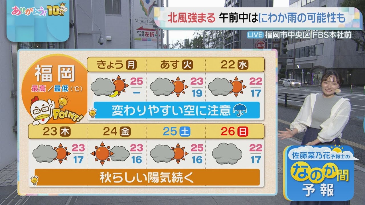はい。福岡市は雲が多く、あまり日差しが届いていません。ひんやりと感じられる朝になりました。 うん。 皆さん見てください。私これ結構上がりますよ。 スポーツやっぱり 鍛えてるからかな。 大事なんですね。 はい。くり背中にはならなそうです。 さあ、昨日は一気に秋らしくなりましたよね。気温があまり上がりませんでした。 最高気温は福岡市で 23.5°、北九州市で 222.6°など25°に届かないところがほとんどでした。ちなみに福岡市では 25度未満、え、夏日でなかったのは 4ヶ月ぶりだということです。 今日はこれよりは少し気温は高くなりそうです。 うん。 ではまず天気図から見ていきましょう。 え、日本付近には到圧線が縦に並んでいて 込み合っています。こういった気圧配置の 場合風が強まります。今日は北寄りの風が 強めに吹きた波も高くなりそうです。沿岸 の地域ではご注意ください。え、そして 南性の会場南シ会場には台風24号が発生 しています。 進路の予想です。24号はこの先大陸方面 に進む見込みです。今週金曜日には熱帯低 気圧に変わるでしょう。日本への直接の 影響はなさそうです。では時間ごとのお 天気です。福岡北九州地方雲が広がり やすいでしょう。に雨の可能性もあります 。夜には晴れるところが多い予想です。 続いて地後地方地方佐賀県です。こちらも 雨マークがついていないところも雨の可能 性があります。傘を持ってお出かけ ください。 今日の気温はどうなのか。昨日ほどは、え 、下がらないんですが、それでも福岡市で 25°、北九州市で24°など過ごし やすい容器でしょう。1週間丸分かり7 日間予報。しばらくは雨マークはついてい ないんですが、雲が広がりやすいです。 短い時間の雨にご注意ください。来週に かけてもそれほど暑くなる日はありません 。明らしい容器が続くでしょう。お天気 でした。