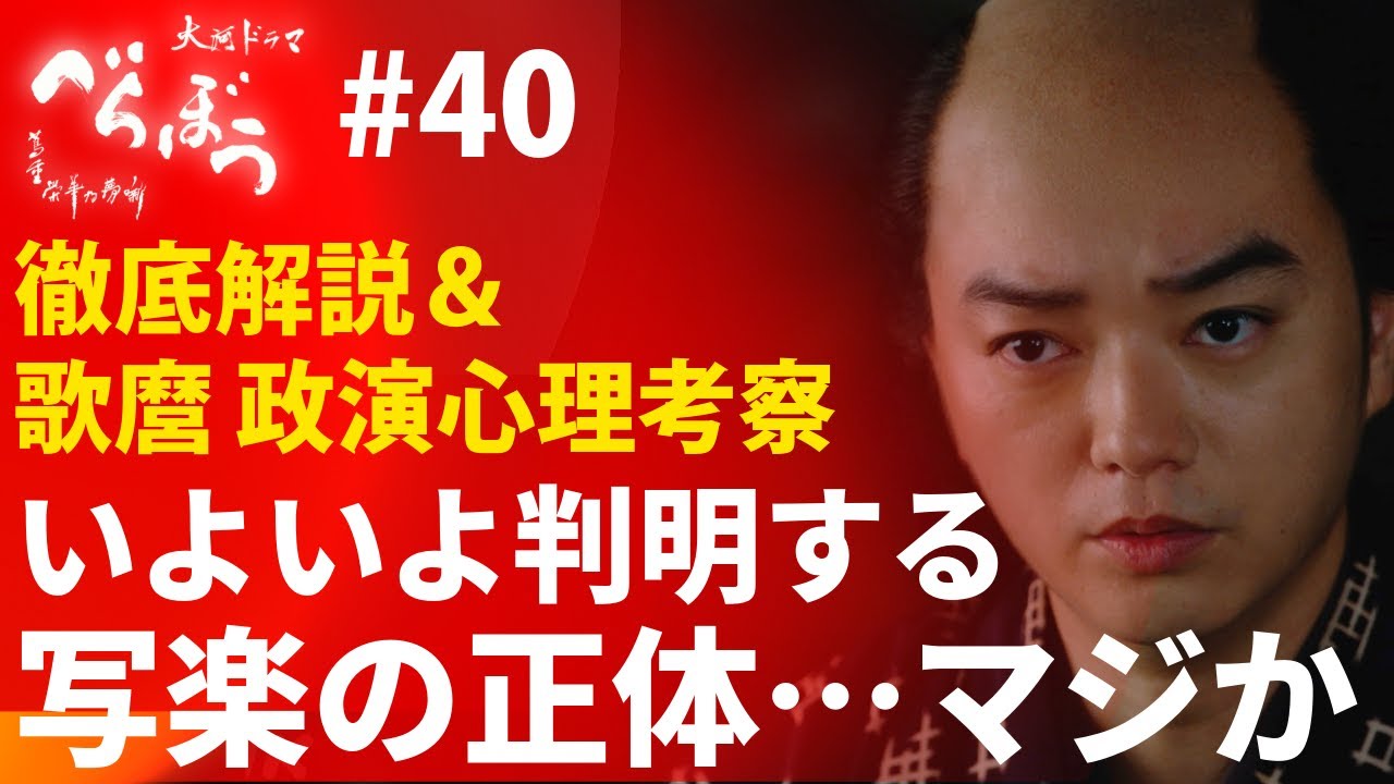 はい、皆さんこんにちは。山岸下と申し ます。本日はベラボ第40話の徹底解説を お届けいたします。私元々映画業界に7年 ほどおりましたので映像 エンターテイメントの業界にいた人間の 視点としてこういう風に解釈したよ、 楽しんだよということを皆様にお届けして まいります。いい意味で歴史系 YouTuberの皆様の動画と共存する 動画となっておりますので合わせてお 楽しみをいただければと思います。さあ、 それでは話入っていければと思います けれども、全部でここのお話しさせて いただきます。9番のところだけですね、 あの、シャラ君についてのネタバレを含み ます。公式ガイドブックでね、最終回まで のあらすじが明らかになりましたので、ま 、まず8番まで心地よく聞いていただいて 、ネタバレ嫌な方はここでストップして いただければと思います。さあ、今回も ですね、非常に盛沢さんの話ではあったん ですけれども、動画を作るにあたってどこ から話をしようかということで考えたん ですけれども、まず正信からですね、なぜ ならそこから色々な話が繋がるからで ございます。北尾正部を操る鶴やさんと いうことでございますけれども、まあ今回 ですね、ま、北尾正が気持ち分かるのよ。 北信のその要はね、手りやった後にまた 何かを書くっていう風になるとこれ北信が 自分で言ってましたけれどもね、 お行儀良いもの書いたと思ってもイチ門 つけられてそんな意はなくてもまた同じ ように処罰を受けるっていう恐怖心があり ますのでいやもうそんなの書きたくない ですよみたいななんならもう手りしてて手 がもう筆とか持てないんですよって言い ながら手さきすごい繊細に生じ張ってまし たけれどもまそういった感じでしたよとた ただそれを見て2人は2人ね、スタジュド 鶴やさんはあのビビってんのは本音だ けれども書きたくないとは絶対思ってない よねっていうことはもう分かってるんです よね。なんで青の呼吸でま、ある種北尾 正信の心の中にある本音をもう くすぐりくっ てくすぐってやっぱり書きますっていう風 にさせるって話をしていったって感じです よね。もうこれ一貫してですよね。もう 2人が何か断るごとにスタジュと鶴やさん がこう視線を合わせて似やりとしていたの で完全にもうねあの踊らされた感じだった なという風に思います。ま、その話をここ から下でしてくんですけれども古川優太 さんというね、このミュージカル会にね、 演劇ミュージカル会におけるカリスマが 北信演じる。ま、もちろんはまり役なん ですけれども、あの な、なんでこの役なんだろうなと思った ことあったんですよ。なんかもうちょっと こう表金じゃなくてもっとプリンスっぽい 役というかなんなら北尾茂正マを演じても ねいいのかなと思ったんですけれどもね ここに来てついに歌いましたね。なので あの古川優太さんのキャスティングがこう いうところも想定していたんだなという風 に思いましたけれどもそんな北尾正信です けれどもこれはま本人も何回も言ってます けれども元々モテたくてこの仕事を始めた というところがありますよね。なので モてる、モてたい、ちやほやされたい、 人気者になりたい。これが結局彼の モチベーションを向上させる、持続させる 装置であるわけなんですよね。なのでそれ を、ま、スタジオも鶴やさんも本人から その言葉を聞いてますからね。なのでその モテたいという心をこちょこちょ こちょこちょくすぐらせたというのが今回 スタジュと鶴やさんがやったことでござい ます。で、結果的にね、あの、調子に乗せ られてる、踊らされてるってことは冷静に なった正信自身も、正も別にバカじゃない ので気づいてるんですよ。なので終わった 後の本ね、これあの歌まとのシーンの前の ところでシーンとしては存在してないけど 多分1人になって部屋でああ、また津田じ さんと鶴やさんに踊らされてしまったはあ みたいな感じのですね。なんか1人の シーンがあるようなことが想像できるわけ ですよ、私なんかは。で、その上でその後 歌とあって、ま、描き体力っていうね、 そのものもちやほやされてまた描きたい。 描くっていうのもモテたいから描くんだ けど描くこと自体は嫌なことでもないから やっぱりそれやりたくなっちったなって いうことで筆をまた取ることになったわけ でございます。で、ここまでだったら別に そこまでちゃそこまでなんですよ。 ポイントとしてはそのちやほやされて心を 踊っちゃってモチベーション上がって描き たい欲その欲を歌まに語ったことこれに よって単発のシーン今回の北尾大正信は こんなんでしたではなくて物語全体に 繋がっていくものとなっていたわけで ございます。で、歌タまに語ることによっ て歌ま自身も描くということは、これは、 ま、鳥山石園先生に最初ね、絵を習って 純粋に子供の心として描くことが楽しいと 思ったけれども、ま、その後は色々な形で 苦しいことも