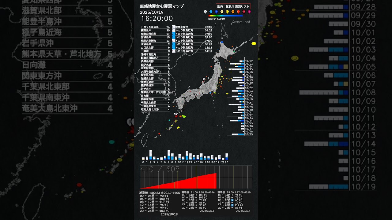 内容:2025年10月19日 作成:2025年10月20日出典:気象庁ホームページ 震源リストより 🔗 https://www.data.jma.go.jp/eqev/data/daily_map/20251019.html 有感及び無感地震1日分の動画です本動画はYoutubeにも後ほどあがります。 🔗 https://youtube.com/@vnet_bot#地震 #jishin #earthquake EARTHQUAKEjishinNEWS地震震源情報