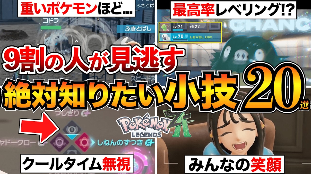 はい、どうもこんにちは。ベトです。今回 は湿気得薬する小技まとめということで 言われないと気づきづらい小技をまとめて 紹介いたします。内容はこちら。概要欄に 目次あります。ま、ゲーム内のチップスと かに書かれているものもあるので、これ 知ってるなっていうやつは都度スキップし ながら見ていってください。あと、ま、 今回もね、ストーリー以外の部分、 ポケモンやシステム的なネタバレはあり ますのでご了承ください。それでは本編、 まず1つ目。経験で復活。HPが0になっ て瀕死になってしまったポケモン、本来は ポケ線行ったりとか元気のかけらなどで 復活するんですが、実はね、経験値アとか 、ま、あとは不思議な目とかレベルアップ することでも復活することができます。ま 、実際ね、ここからレベルアップさせてみ ますと、こんな感じでほんのちょっとね、 体力が復活します。ま、ポケ戦行くのが めんどくさいでも元気のかけら使いたく ないみたいな時は、ま、経験値雨使って レベル上げをする。こちらのやり方で復活 させてみてください。続いてお任せ回復。 回復はポーチから自分でアイテムを選んで 使うことできるんですが、それ以外にも HPが減ってるポケモンを選んでR スティック押し込みでも回復できます。 自動でアイテムを使って回復してくれます ので、ま、自分で選ぶのがめどくさいって いう場合は、え、こちらRickでお任せ 回復してみてください。完全に満タの状態 にしてくれます。で、多分状態以上も回復 してくれますね。ま、上にもね、ボタン 表示書かれているんですが、ま、ちょっと 気づきづらい要素なので知らなかった方は 是非 続いて連続不打ちでレベル上げ。これは バトルゾーンでトレーナーと戦う時の小技 。ま、前回ね、不打ちのコツ紹介したん ですけども、え、この不打ちをですね、 連続でやる方法があります。1回バトルを 仕掛けた後、一定距離離れるとトレーナー からね、逃げることができるんですよ。 そうすると敵の手持ちは復活してまた 見失いますのでこの状態でまた不打ちが できるという感じです。で、バトルを 仕掛けた直後すでに一定距離離れていると 敵がね、次のポケモンを出すまでもなく こういう風に逃げることも可能です。なの でポケモンに不打ちさせて自分はダッシュ で離れる。これを繰り返すことで結構ね、 効率よくレベル上げることできます。ま、 トレーナーによって獲得経験値も違います ので、なるべく核上の相手を狙って、ま、 一撃で倒してという風に繰り返してレベル 上げしてみてください。ま、賞金メダルと かは手に入らないんですが、経験値だけで 見たら演出とかも挟まないので、ま、 かなり効率いいかなと思います。あとはね 、技を仕掛ける系のボーナスカードに関し てもこの方法ですぐに達成することができ ます。意外とね、トレーナーから逃げられ るっていうこと自体知らない方もいると 思いますが、え、結構ね、役に立つ小技な のでこちらやってみてください。続いて 重いポケモンほどということで、ま、 ポケモンにはね、それぞれ重さが設定され ています。ポケモン図時間で確認すること できるんですが、この重さによって 吹き飛ぶ距離が異なります。ま、実際にね 、吹き飛ばし系の攻撃を軽いポケモンと 重いポケモンにやってみると、ま、これ ぐらいね、飛距離が違うという感じです。 重いポケモンほど吹き飛びづらくなる。 例えばね、こっちの攻撃モーション中に 遠くに吹き飛ばされちゃうと攻撃が当たら なかったりするんですが、体重が重い ポケモンであれば吹き飛ばされても、ま、 ギリギリね、技が届くとかいうこともあり ますので、実はね、これちょっとバトルに 影響する要素です。ここら辺もね、本作 ならではの作り込みということで、ま、 一応ね、重さも考慮して手持ちとか選んで みてください。いろんなポケモンで試して みると面白いです。続いて障害物の壊し方 。ま、岩とか蔦とかヘドロ。前回ね、壊し 方紹介したんですけども、それ以外にも、 ま、コメント見る限りいろんな壊し方が あるみたいです。岩に関しては、ま、 岩砕きではなくても格闘系の技とかだと 大体壊せるし、ま、それ以外にも転がると か、あとは、ま、地面技とかでも破壊 できるみたいなので、ま、これもね、色々 試してみてください。僕はね、これ知ら なくて、ずっと曰惑きを手持ちに覚えさせ ていたんですが、ま、それね、ちょっと1 枠使っちゃうのもったいないので、ま、 全然ね、他の強い技でも壊せると。で、 あと蔦に関しては炎タイプの技以外にも 切り裂とかあと飛行系の技とか葉っぱかっ たリーフブレードみたいにま、なんかね、 こうキル系の技かなとかだと破壊可能です 。これもね、色々試してみてください。で 、続いてヘドロ。ヘドロに関しては水系の 攻撃と一部のエスパータイプの攻撃。 ちょっとね、基準はよくわかんないんです が、年力とかサイコキネシス