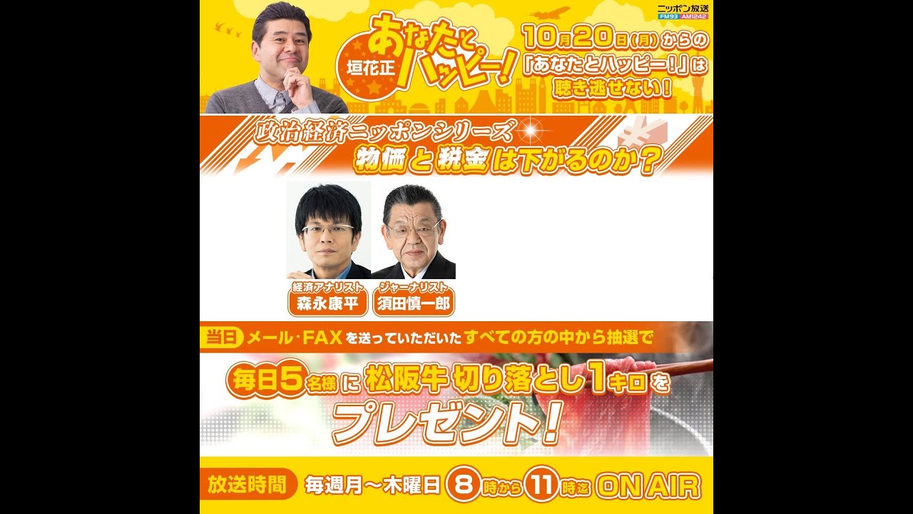 [音楽] あなたとハッピー。 [音楽] [音楽] [拍手] 10月21日火曜日。時刻は8時になり ました。 おはようございます。柿正しです。 おはようございます。日本放送熊美です。 さあ、今朝のコメンテーターは経済アナリスト森永公平さん。おはようございます。 [音楽] おはようございます。はございます。 ま、公平さんにはちょっとね、 え、色々ベイスターズに関して 言いたいことがあります。な んかありました。なんかありましたか?ましたよ。 あなた、 あなたベイスターズが3連敗したその3 連敗ずっと大阪にいたらしいすね。 ちょ、仕事で大阪にいてですね。 はい。ま、ちょっと1日目の時は Twitterでも呟いたんですけど はい。 ちょっとあまりにもベースターズファンの皆さんからですね。 はい。 やめろとね。あなたの勝率を考えたら甲子園球場に行くべきではないと止められたわけですよ。勝率だって [音楽] 2%ぐらいしかないわけですから。 はい。ま、ちょっと上がって 4%ぐらい。4% で4%まだ4 割じゃないんだよ。4%だよ。 今年に限ってはもう勝率 100%です。1 回だけだろ。 それで厚生球助場乗り込んだらあんなにチャンスを作ったのにですね。初戦ですよ。 私は何度も言いました。初戦を取るか取らないかが全てだと チャンスでなんかね、呪われたように凡するんですよ。ああって気づいた。 え、 呪われた。 甲子園球助に逆身がいるんだと。 行ってると。 ま、でもあの、阪神ファンの皆さんからですね、一応 [音楽] 3試合終わった後に、 ま、本当のMVP はモリスタでもサテルでもないとお前だかことをました。 え、見事にば実力だと思います。 DNAベイスターズは阪神タイガースに 3 連敗しましてですね、セリーグ圧倒的な強さでした。 阪神タイガースが晴れて日本シリーズに行ってですね、良かったよかったということでその喜びの声も伺いましょう。え、す田慎一郎さんおはようございます。 [音楽] はい、おはようございます。え、こ平さん本当にありがとうございました。ブラボ平イエー。 何ですか?本当にあ、ちょっと待って。元気ですね。 元気?元気? 昨日9時50分まで 朝オッケー。工事アップやって 夜はまたこれ同じ飯田君との組み合わせで 6 時から9時50分まで話してて うん。す クタクタだろうと思ったら もう勢いそのに すごいですね。 いやおめでとうございます。 はい。ありがとうございます。 で、ソフトバンクと対戦相手が決まりましたよね。昨日ね。どうですか?意気込みとしては日本シリーズに向けて。 いや、もうリベンジですね。リベンジしかない。もうね、タイガースは万全の体制を整えてですね。もう大変ですよ。もう新地で六本切でもう頑張ってますからね、今ね。 そう。なんかあれですね。 藤川監督って面白くてもどんどん外食しろって。今日もデイリースポーツの一面にね、なんか福岡に美味しい食べ物屋さんいっぱいあるんだから外食してリフレッシュして試合に集中しろうみたいな。遊びすぎるなって言わないんですね。 そう。そう。ま、これがまあメジャー方式なのかなと思いますよね。 え、ね、気を抜くとこは気を抜いて そうか。 引き閉める時は引きしめたいと。 夜の街に関してはね、菅田し一郎さんが一番詳しいですからね。 確かに。 うん。 確かにじゃないですよ。 そうですよね。 うちの神さんも聞いてんだよ、これ。奥さん聞いてんの。女性に対してドアホ連発してるのを奥さんはどうしちゃってるんですか? いや、なんか苦ニしく ただね、この番組は本当に菅田し慎し一郎さんに感謝をしてるんです。 はい。 なんかYouTubeとかでもね、 この番組を聞いてくれてる方がコメントで津田さん、ここでもドアホって言ってくださいよって言ったら、 [音楽] 俺のドアホが聞けるのは某番組だけつって。 そう、そう。 はっきりおっしゃってください。 すごいブランディングされて 限定品ですから。 限定ですから。 数売りはしないってこと。 野りはしないですよ。だ、昨日のね、夕方 6 時から日本放送のね、津田慎一郎さんと飯田工事アナウンサーの番組 聞き逃した方は是非オープニングから聞いてください。本当に聞き応えのある番組でした。で、僕 1番印象残ったのは菅田さんが冒頭でな んだこの番組はと。 うん。 親父しかいないじゃないかと。出てくる連中もみんな親父だと。確かにそうでしたね。そう え。女性の声が1 秒も流れない番組だったんですよね。 そうなんですよ。で、しかも冒頭あのまの放送が始まる前にね、体がですね、挨拶来て [音楽] 増山さやが、え、出がですね、挨拶に来て、 なんかもうね、もう身が引き締まる思いでバグしてな んすかを見たら、あの、いわゆるそういう昭和な発言は 控えるようにというプレッシャーを感じてしまうんですね。 いや、そうじゃなくてですね、え、今日も頼みますよっていうことで、もう自然と私ね、直立不どになって飯なもそうでしたしね。 も、あの、緊張感や。 あの、緊張感やね。 そのね、カですよ。もう