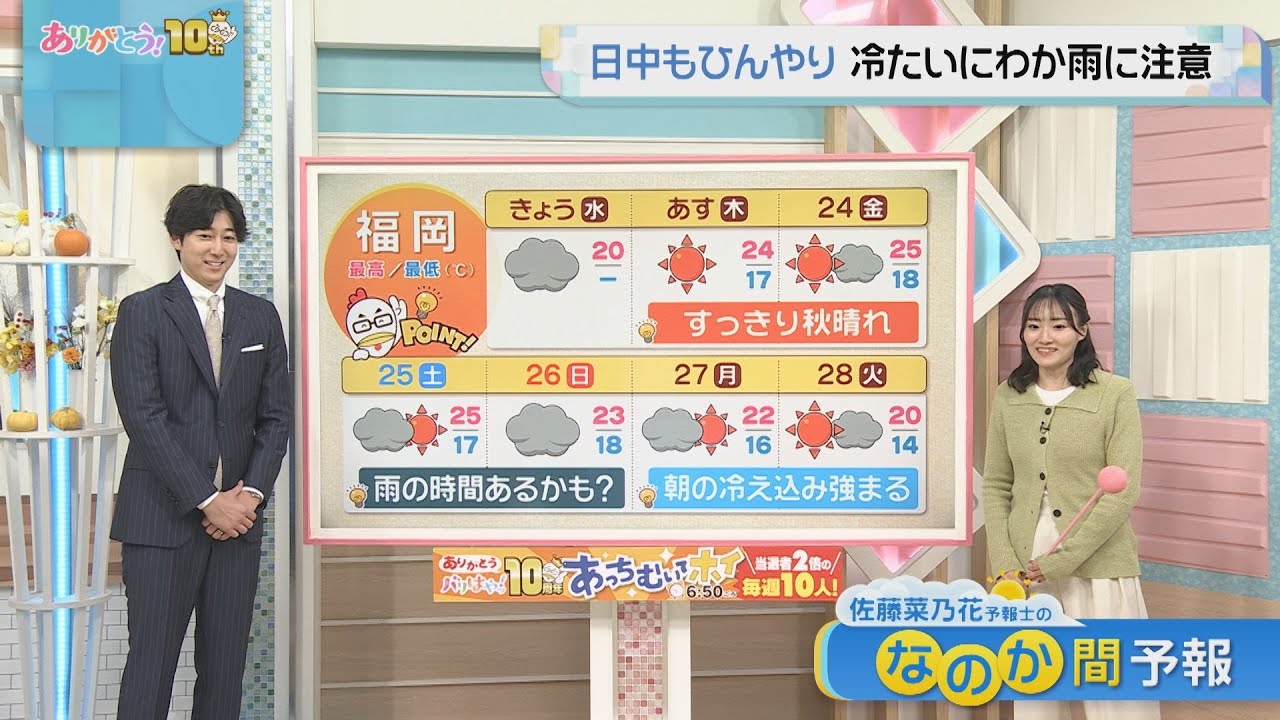 佐藤菜乃花(さとう・なのか)気象予報士のお天気情報です。福岡と佐賀の22日の天気をお伝えします。