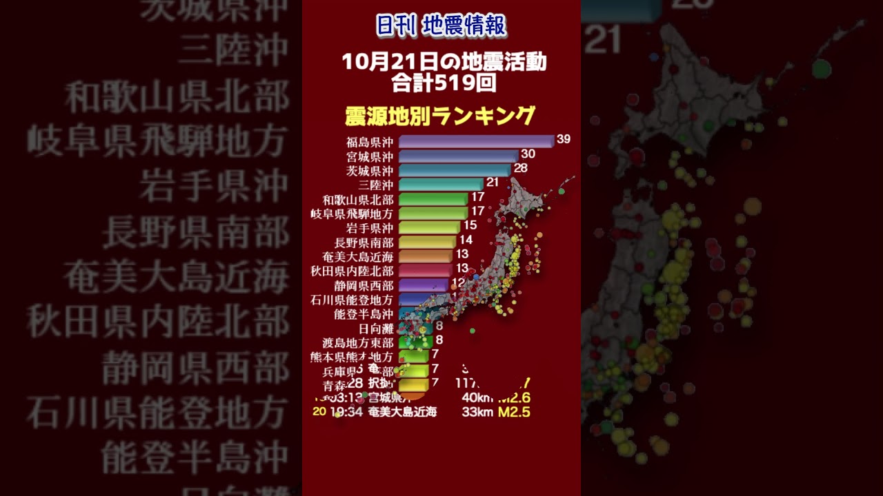 【地震情報】10月21日の地震活動 Heat. Hey. Hey. 2025年10月21日の地震活動です。 気象庁より発表されます無感地震のデータを震源地ごとに集計しております。 #地震情報 #無感地震 #気象庁 10月21日NEWS南海トラフ地震情報気象庁無感地震震源情報