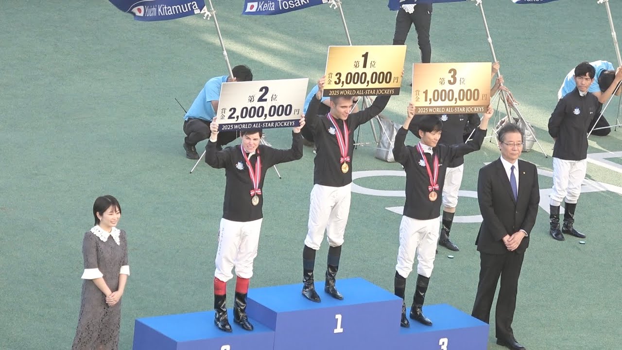 [音楽] 皆さん、本日は札幌競馬場にお越しいただき誠にありがとうございます。 ただ今より2025 ワールドオールスタージョンキーズ総合表彰式を開始いたします。司会は私高田正子と HPC アナウンサー水がお送りします。どうぞよろしくお願いします。 [音楽] 表彰式に先立ちましてご来場の皆様にお 知らせいたします。本日の払い戻しの終了 時刻は17時となっております。払い戻し をされる方はお時間までに120発売所 までお越しください。 さあ、それでは出場機種の紹介に先立ちまして表彰式のプレゼンターのご紹介をいたします。数々のドラマ映画でご活躍中の田未来さんです。どうぞご入場ください。 [音楽] [音楽] [音楽] 田未来さんです。よろしくお願いいたします。 お願いします。え、な JRA 日本中央競馬会理事長吉田正義もプレゼンターのお手伝いをさせていただきます。よろしくお願いします。 さ田さん、今日1 日レースをご覧いただいたと思いますが、 世界のトップジョンキーによるはどこで一緒でしょうか?あの、本当に間近でレースを見させていただいて、私自身すごく大興奮でしたし、あの、観客の皆さんの性が本当にすごくて肌で感じて、私自身もあの、ま、大きな声は出せなかったんですけど、心の中で頑張れ頑張れ行けってはい。 [音楽] 応援しながらエースを拝見していました。 はい、どうもありがとうございます。 ありがとうございます。 本日トークショーもございましたが、引き続きですよろしくお願いいたします。 さあ、それでは白熱した戦いを繰り広げてくれた出場機種の皆さんをお呼びしましょう。皆様大きな声援でお迎えください。 World まずはワールドオールスター選抜の出場 機種です。 [音楽] Паゼンチフランシスコサルベ です。 [音楽] ノイズコール浜せハスピ [音楽] [拍手] たクリティアントー [音楽] [音楽] オーストラリアプレイグ [拍手] 地方競馬代船橋ホンダー正グ 先発の出場機種です。 北村 [拍手] 佐井 [音楽] 横 [音楽] [拍手] [音楽] 明け豊 クリスル 以上 2025ワールドオブスタージョンキーズに出場した 14名の機種です。 [音楽] さあ、それでは表彰を始めていきたいと思います。まずは優勝チームの発表です。 優勝はワールドオルサ選抜の皆さんです。 [音楽] さに場所を映してから9回目なんですが、 初めてワールド大沢選抜の皆さんが優勝となりました。 そうです。おめでとうございます。 [拍手] さあ、それでは優勝したワールドオール スター生の皆さんに商品の増貞を取り行い ます。増貞者は田未来さんと吉田理事長 です。よろしくお願いいたします。 優勝チームの皆様には和島塗りのパネルが 送られます。元半島地震や防務 災害からの復興を願い石島 市の電動芸品を商品とさせていただきまし た。 おおめとうござい ます 。 [拍手] ワールドスター選抜が 246ポイント。そしてJ選抜が202 ポイント。このでワールドオール選抜が 9回し初めて、 え、優勝なりました。 おめでとうございます。さあ、ワールドオルスタ選抜の皆さんおめでとうございます。のをりください。ワそれでこでセッションの時間とさせていただきます。 [音楽] 皆様よろしいでしょうか? はい。会場の皆さんもシャッターチャンスですね。 はい。是非はい。さてください。 はい。はい。 それでは以上でセッションを終了とさせていただきます。皆さんどうぞおりください。おめでとうございました。 ありがとうございました。 [拍手] [音楽] [音楽] 続きまして、2025ワールド オールスタージョッキーズ2日間の種表彰 に移らせていただきます。まずは第3位の 発表です。 第3位は 40ポイント獲得。JR選抜 です。おめでとうございます。 ください。 では続きまして第 2セカンド 66 ポイントを獲得ワールドホールスター選抜です。 [音楽] では、ある 2025 ワールドオールスターチョッキーズ優勝を発表します。第 1位は 73ポイントを獲得。 ワールドオールスター選抜です。ハでは表彰に移らせていただきます。増者は藤未来さんと吉田理長です。 [音楽] [拍手] 第3 位に輝きました世紀種にブロンズメダルが合成されます。おめでとうございます。 おめでとうございます。 [音楽] 続いて賞金100万円が想定されます。お めでとうございます。 続いて第2位に輝きましたクレイグ ウィリアムズ機種にシルバーメダルが増さ れます。 続いて賞金200 万円が増定されます。おめでとうございます。 おめでとうございます。 [音楽] そして第1位に輝きました判定機種に ゴールドメダルが想定されます。選手 続いて商品300万円が想定されます。 そして第1位のトール完成機手には 2025 ワールドウルスタージョッキーズ優勝トロフーが定されます。おめでとうございます。 おめでとうございます。それではここでセッションのお時間とさせていただきます。 の皆様よろしいでしょうか?い、会場の皆様もどうぞごください。 [音楽] はい、それでは以上でセッションを終了と させていただきます。田未来さん、吉田 理事長、