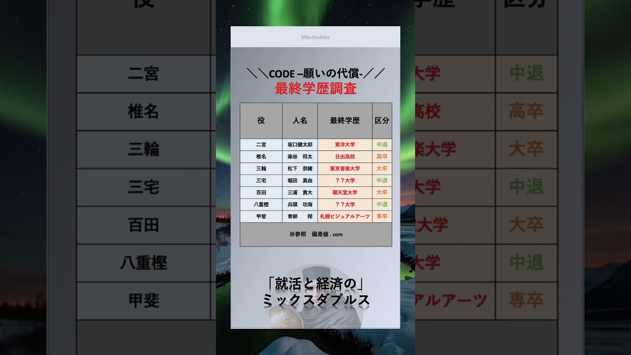 あの俳優?![CODE -願いの代償-] #俳優 #最終学歴 #大学 #出身大学 #shorts #有名 #映画 #ドラマ #code #願いの代償 #坂口健太郎 #松下奈緒 #染谷将太 人気の俳優[あのドラマ出演者の最終学歴を調べてみました。(CODE -願いの代償-) celebrity松下奈緒