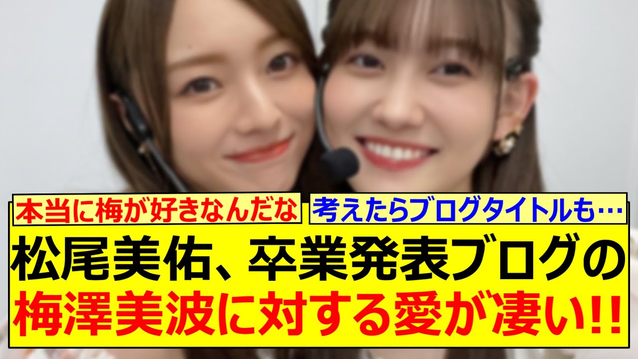 松美ゆ卒業発表ブログの梅沢南に対する愛 がすごい。 [音楽] [音楽] 松尾さんの卒業発表のブログがもしも心が 透明ならの写真の本当になく 松尾さん本当に梅が好きなんだな。 考えたらブログタイトルも空扉の歌詞だった。 ブログのタイトルが松尾おさんが大好きな梅さんのセンター曲の空扉の歌詞なのがまたグっとくる。 梅沢南を一に思いタイトルが空の歌詞。写真がもしも心が透明ならアンダラでシンクロニシティ一綱松おゆを押せて誇りに思う。最後にもしも心が透明なら披露する機会ないかな。 [音楽] それな、あの曲折り面埋めだけになっちゃう。 もしも心が透明ならの更新長ユニットがついに梅ちゃんだけに 好きなら梅が去るまでいてほしいぞ。見送ってから卒業ってなるとその後 [音楽] 1年半とか2 年後にやっと卒業ってなるから普通は待ってから卒業みたいなことはしないと思う。 卒業引退か梅くらいは見送って欲しい 気持ちもあるけど自分の人生だもんだ。 ライブで文字通り発行してる松尾さん好き だった。ご視聴ありがとうございました。 この動画が良かったらチャンネル登録、高 評価お願いし