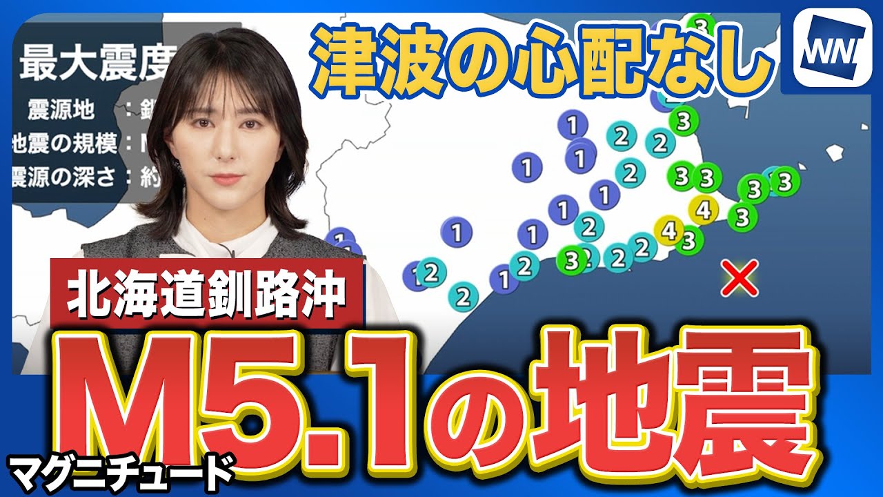 【地震情報】釧路沖でM5.1の地震 最大震度4 津波の心配なし