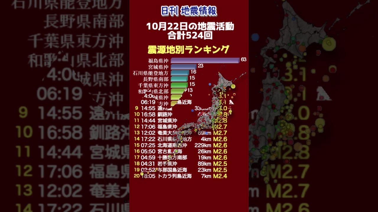 【地震情報】10月22日の地震活動 Heat. Hey. Hey. 2025年10月22日の地震活動です。 気象庁より発表されます無感地震のデータを震源地ごとに集計しております。 #地震情報 #無感地震 #気象庁 10月22日NEWS南海トラフ地震情報気象庁無感地震震源情報