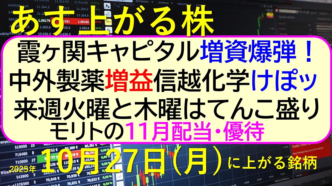 あす上がる株 2025年10月27日(月)に上がる銘柄。霞ヶ関キャピタル増資爆弾!中外製薬増益。信越化学けぽッ。来週火曜と木曜はてんこ盛り。モリト配当~最新の日本株情報。高配当株の株価やデイトレ情報~