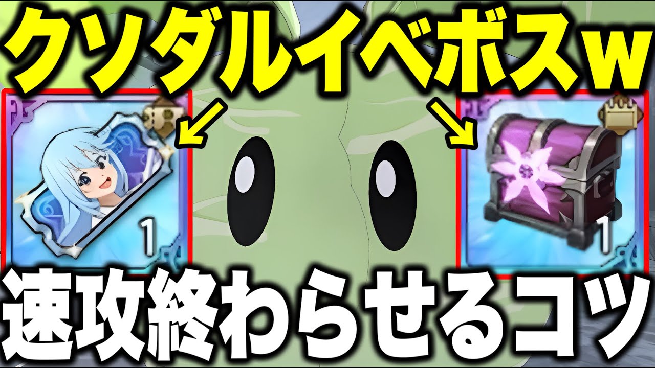 ハローeveryイグざポ。どうもゴス です。ということで本日はですね、 イベントボス兄大キャベツやっていこうと 思います。ということで前回の動画見て くださった方ありがとうございました。 まだ見てない方はの概要欄から見てきて ください。ということでイベントボス キャベスめっちゃめんどくさい。これ めっちゃめんどくさいんですが、え、 めんどくさい中でも、え、なんとかね、 早くこのイベントボスをクリアできる。 もしくは、え、こちらのね、交換所の アイテムを全部クリア、あの、ゲットでき るっていうね、方法ちょっとやっていこう と思います。それではエクストリーム レッツゴー。編成はこちらですね。えー、 この子、え、三笠。三笠の部分は、え、 何かね、投球を、投球じゃないわ、基本 ステータス上げるとかいうキャラで大丈夫 です。イースティンとかシグルドとかそう いったキャラでも大丈夫です。で、ここも シュンとかでも大丈夫です。で、え、ラン スロットは入れた方が強いです。で、あと はMEGミンですね。MEGミンの方は 装備ちょっと生命なんですけれども、猛こ ある方は猛こにしていただいて。で、これ 下見てください。ここね、ここが重要です 。敵の投球増加設定時。これを3人。僕ね 、4だとちょっとね、手こずっちゃったん で3ぐらいがちょうどいいと思います。で 、アーティファクトが、え、攻撃力増加 リク回空ですね。で、これ3で設定して クリアすると巨大化の破片9個追加で、え 、獲得可能になりますんで、これでね、 なるべく早くアイテムを貯めて、えー、 この交換を終わらせるっていうのが1番 いいと思います。で、基本的にや、えっと 、もうね、1ター目、1ター目からあの、 めちゃくちゃ防御がついてるんですよ。で 、このスバコラボキャラで攻撃をすると その防御が剥がれるんですね。なんで、 えー、初手はこうですね。とりあえず単体 攻撃、単体攻撃で、あとMEGの単体攻撃 。これをMEGンが使うと上の防御が2個 取れますの状態で集中をつけた状態で ランスロットで飛ばす。これが初手の動き になります。別にオートでもいいんです けど、くソ長くなります。オート本当に めちゃくちゃめんどくさいっすね。これ 行きます。で、ここまで削って最後、え、 ランスロットで追撃で倒すって感じですね 。 で、次のターンがもっと厄介で、 次のターンマジでもっと厄介なんすよ、 これ。これね、あの、これ今防御5つつい てるじゃないですか。もうこっから正直 あれでもいいんですけど、あの、 あ、これ左右ね。左右の敵は HP20% 以下なったらフがつきます。なんで 20% いかないように倒していきたいんですがとにかくね真ん中は何にせよフが 8つぐらいつきます。 だからどれだけ早くクリアしても そのそのぐらいしかこう無理っていう。ああ、これミスったな。これ 20% 以下だとこれフついちゃうんすよね。 これ でフついちゃって、えー、この真ん中のね 、キャラの節がなくならない限りこの右左 も死なないっていう。ちょ、マジめんど くさいんすよね。だから本当 クリア方法っていうか、あの、早くこの 地獄から抜け出すためにはなんとかキャラ その 1回で取り切れる分のキャベツの量を多く して早めにも使い切るとほらこんな感じで 上にめちゃくちゃフジついてますよね。で 、これ攻撃すれば取れるんですけど、その あの なんだめんどくさい。めんどくさい。これ 何回も攻撃しなきゃいけないので。で、 ちょっとミスるとこんな感じで、あの右側 あ、相手が攻撃してもそうですね。不取れ ますね。で、左右が死なずに左右の攻撃の ターン。これも時間的に入っちゃちゃうん で、ちょ、マジめんどくさい。もうあとは こっから全部オートでもいいです。ま、 最初っから正直オートでもいいんだけど にしても本当にめんどくさいから僕のお すすめはこれですね。レベル3ぐらいまで 上げてとにかく1回の量を増やすで早めに もう全部交換しちゃって終わらせる。それ が1番いいかなと思います。 さあ、こんな感じでちょっとMEGミンが ね、もう必殺打っちゃったら全く機能し なくなっちゃうんで。 でもこれ次のターンでここ終わりですね。 4回攻撃して1234で 不安な方は1回オートをこう切ってここに ターゲッティングしてからオートにして方 がいいと思います。これでね、 フが取れた瞬間死ぬんで全員が こんな感じでめちゃめちゃ時間かかります 。アンドめんどくさいです。ただです。 ただですね、あの全然全然っていうかこの チケットガチャとかもらえないんですよね 。これ10枚。ちょ交換しますか。これ 10枚ゲットできたり、あともう交換し 終わってるんですけどコラボ生物ボックス だったり、ワンステップ進化の証フル覚醒 でこれMEGミンの武器ですね。あとこれ 生物強化の素材ゲットできたり、えー、 コラボスペシャルボックスがゲットでき たりします。なんでね、これは確実にやっ て欲しいんですけど、ま、くっそめんど くさいので