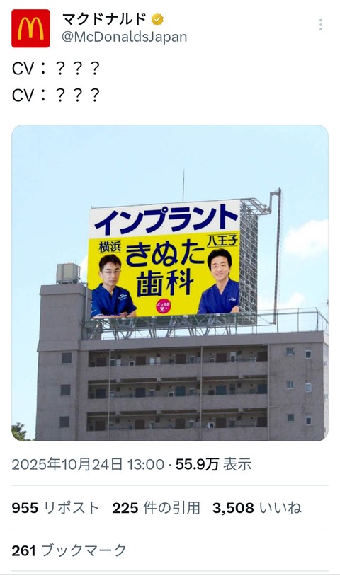 1:以下、?ちゃんねるからVIPがお送りします:2025/10/24(金) 19:45:03.198 ID:p2WmR66AM.netなんで歯医者とコラボしてんの 2:以下、?ちゃんねるからVIPがお送りします:2025/10/24(金) 19:45:48.893 ID:tq3Nw0rs0.netゆとりに宣伝やらすな 2ch2chblognews2ch